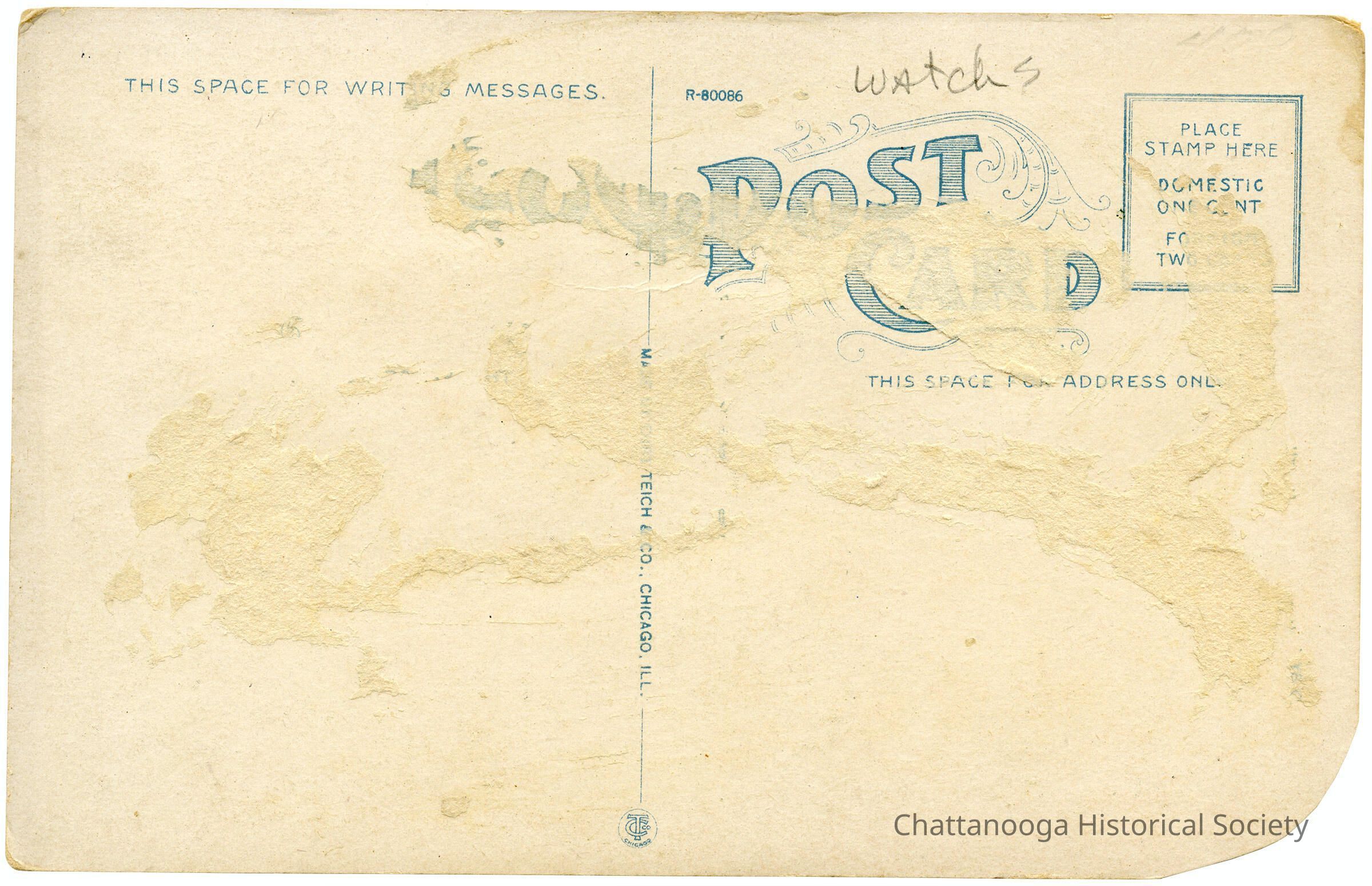 A postcard with the front showing a color-tinted photograph of the watch repair rack of Meyer-Leach Jewelry Company in Chattanooga, Tennessee.