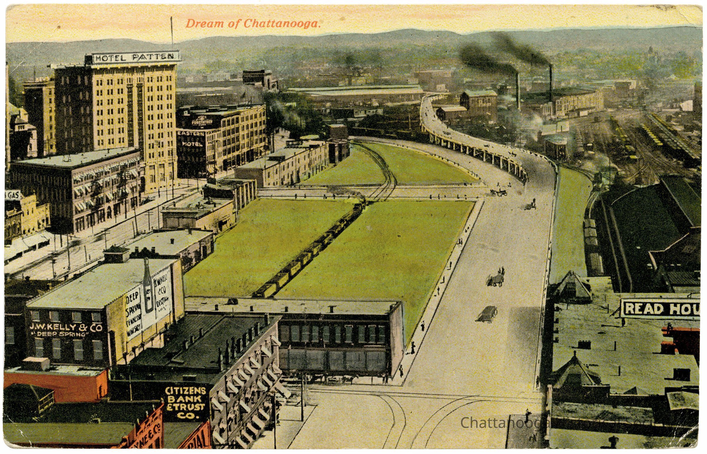 A postcard with the front showing an illustration by Rudolph J. Shutting of an imagined extension of Broad Street in downtown Chattanooga. It wouldn't be until 1926 before the City of Chattanooga would force an extension of South Broad Street by demolishing buildings along 9th Street during the darkness of night.