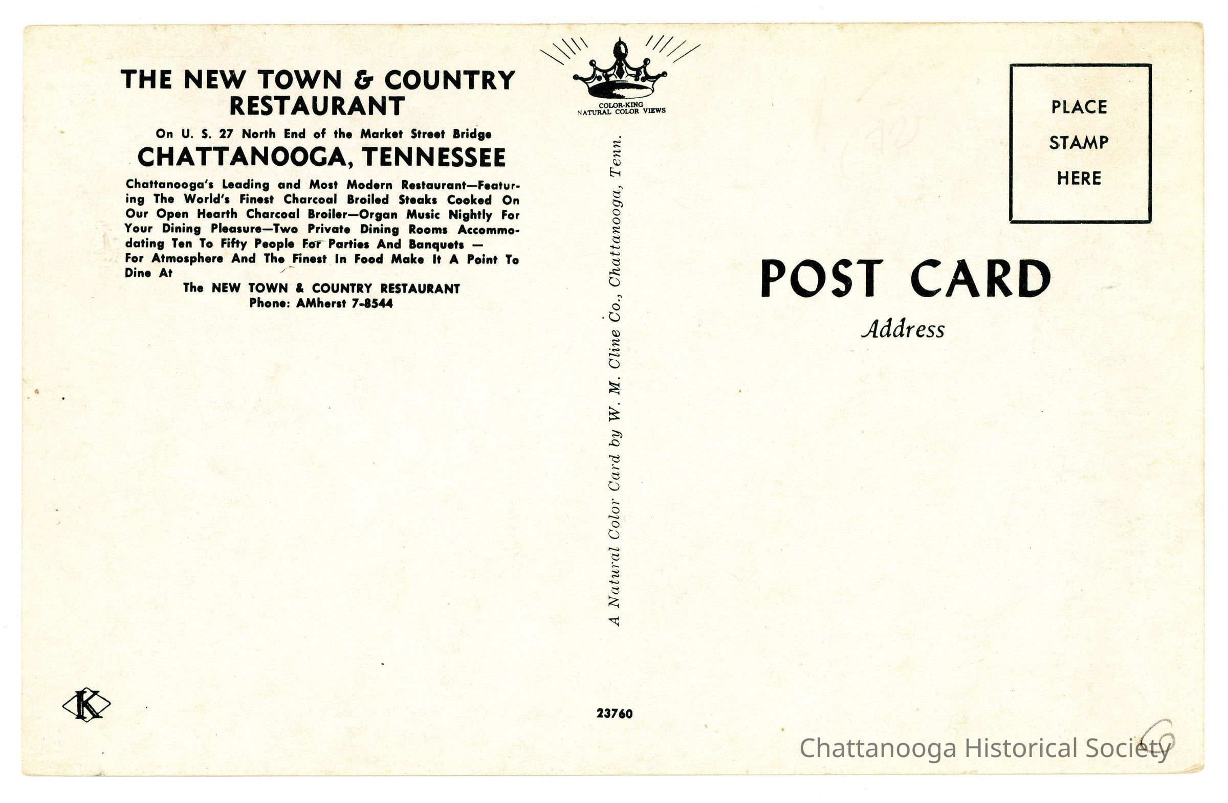 The information on the verso reads "The New Town & Country | Restaurant | On U.S. 27 North End of the Market Street Bridge | CHATTANOOGA, TENNESSEE | Chattanooga's Leading and Most Modern Restaurant - Featur-| ing The World's Finest Charcoal Broiled Steaks Cooked On | Our Open Hearth Charcoal Broiler - Organ Music Nightly For | Your Dining Pleasure - Two Private Dining room Accommo- | dating Ten to Fifty People for Parties and Banquets - | For Atmosphere And The Finest in Food Make It A Point To | Dine At | The NEW TOWN & COUNTRY RESTAURANT | Phone AMherst 7-8544"Subject Person/Organization