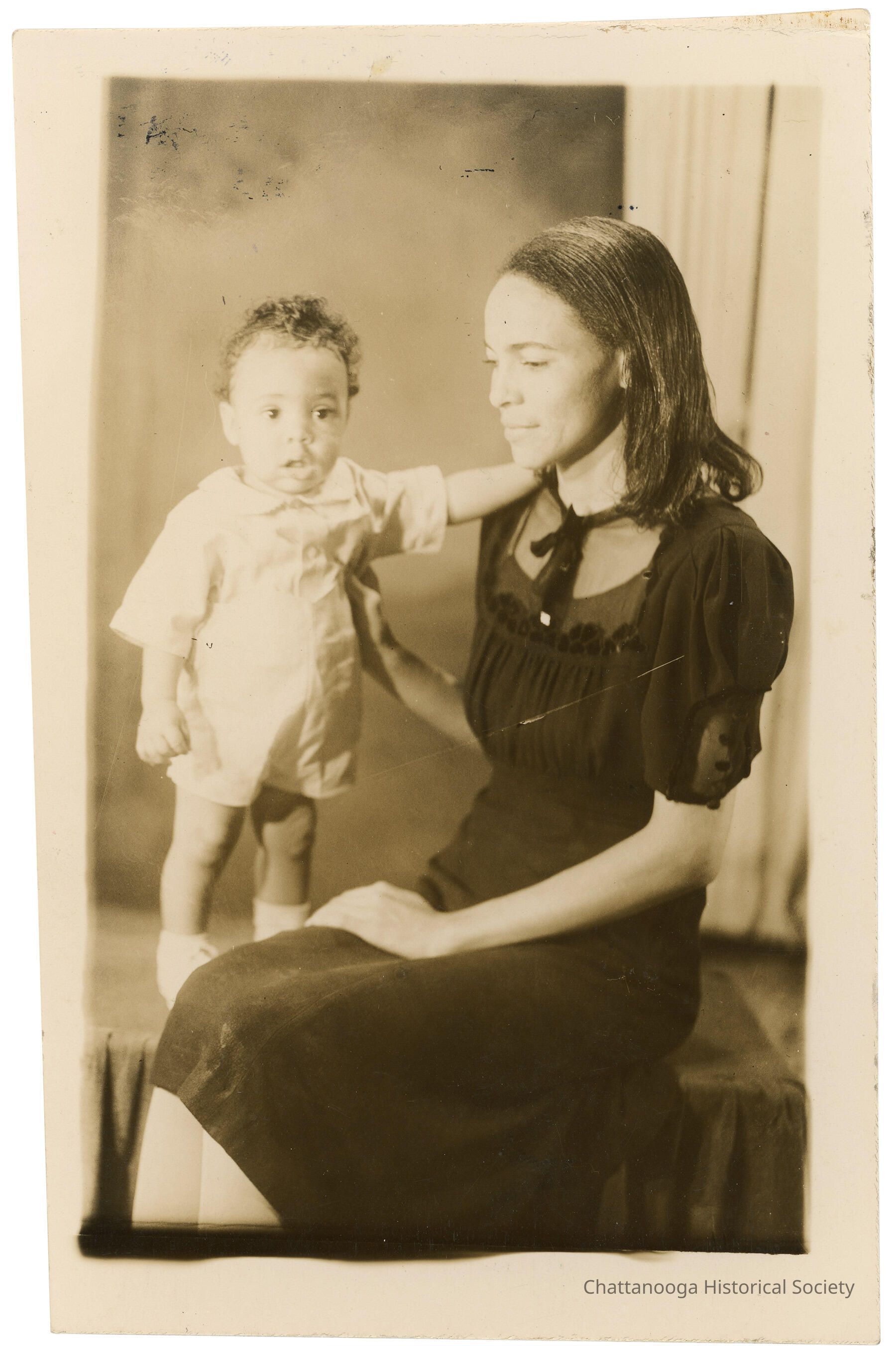 A Black and white photograph developed on postcard paper of a mother and child. The woman is wearing a black dress with sheer panel at neck and sleeves. The toddler is wearing a white button up shorts set or romper. The little boy is holding onto his mother while she supports him with a hand resting on his back. The photograph is stamped on the back "Brazelton Photo Studio, 515 1/2 E. 9th Street, Chattanooga (3), Tenn." in black ink.