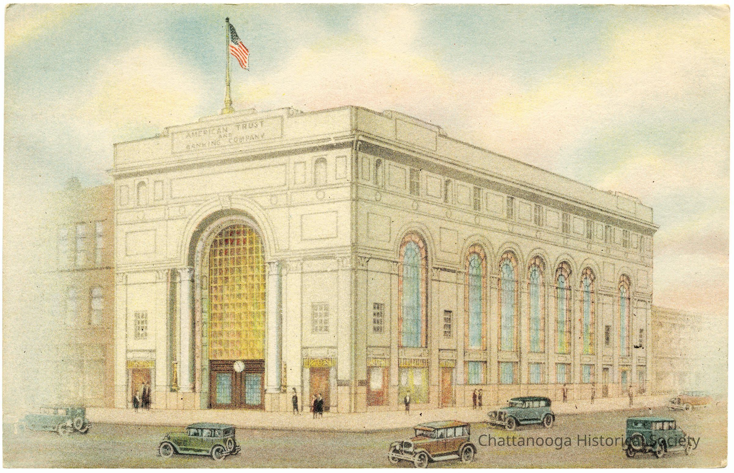 A postcard with the front showing an illustration of the American Trust and Banking Company, once located at the NW corner of Market and 8th Streets, Chattanooga, Tennessee.