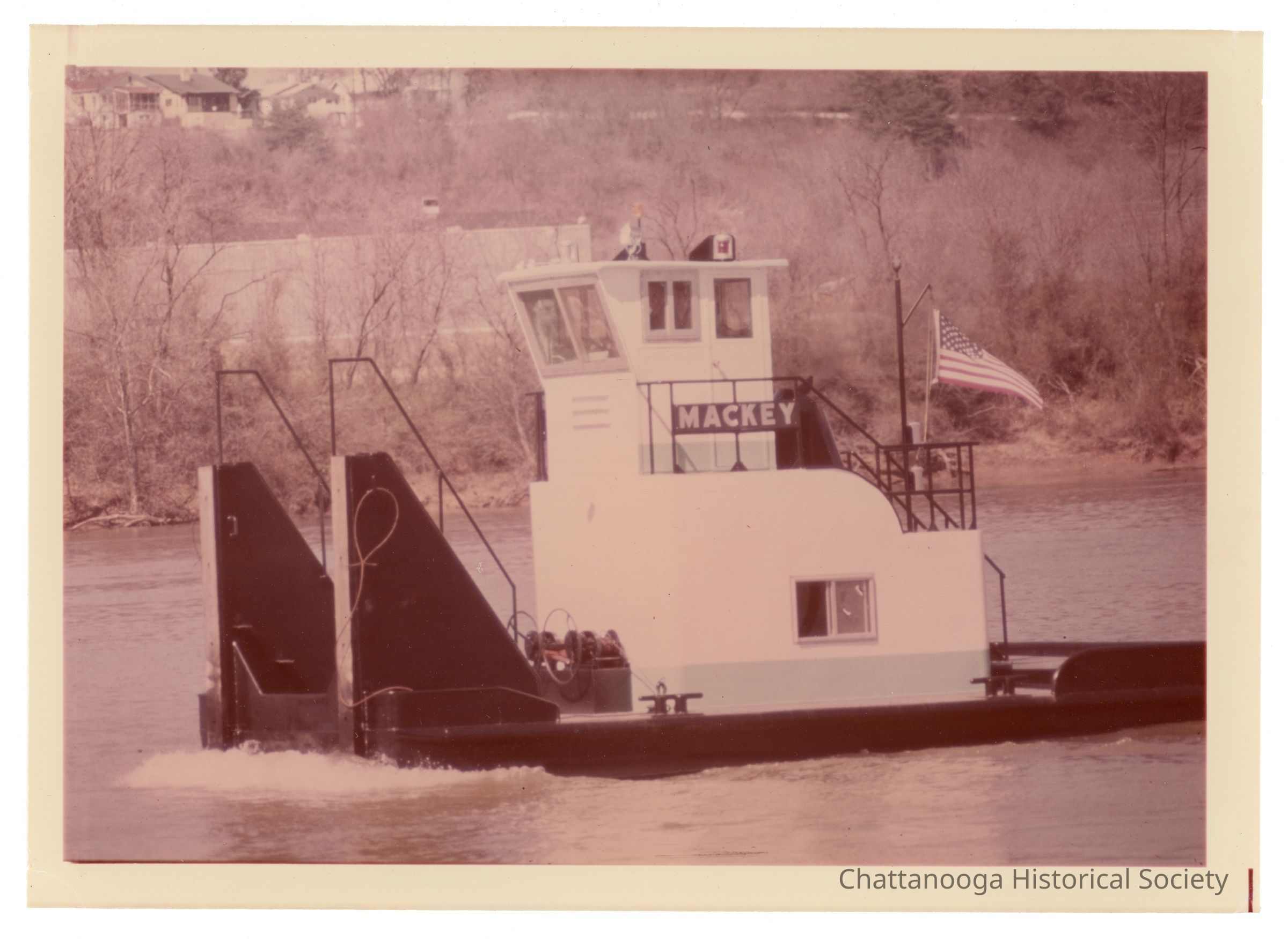 A photograph showing the push tug "Mackey" on the river.Photograph Details