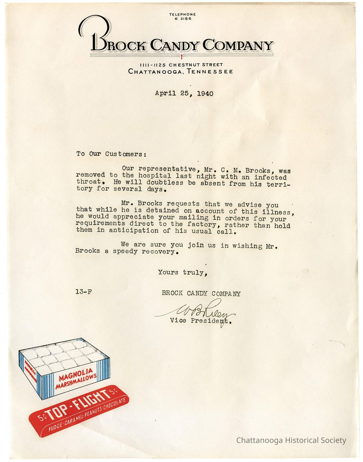 Correspondence from W. B. Riley, Vice-President of the Brock Candy Company, addressing the illness and well-wishes for C. M. Brooks. On company letterhead.