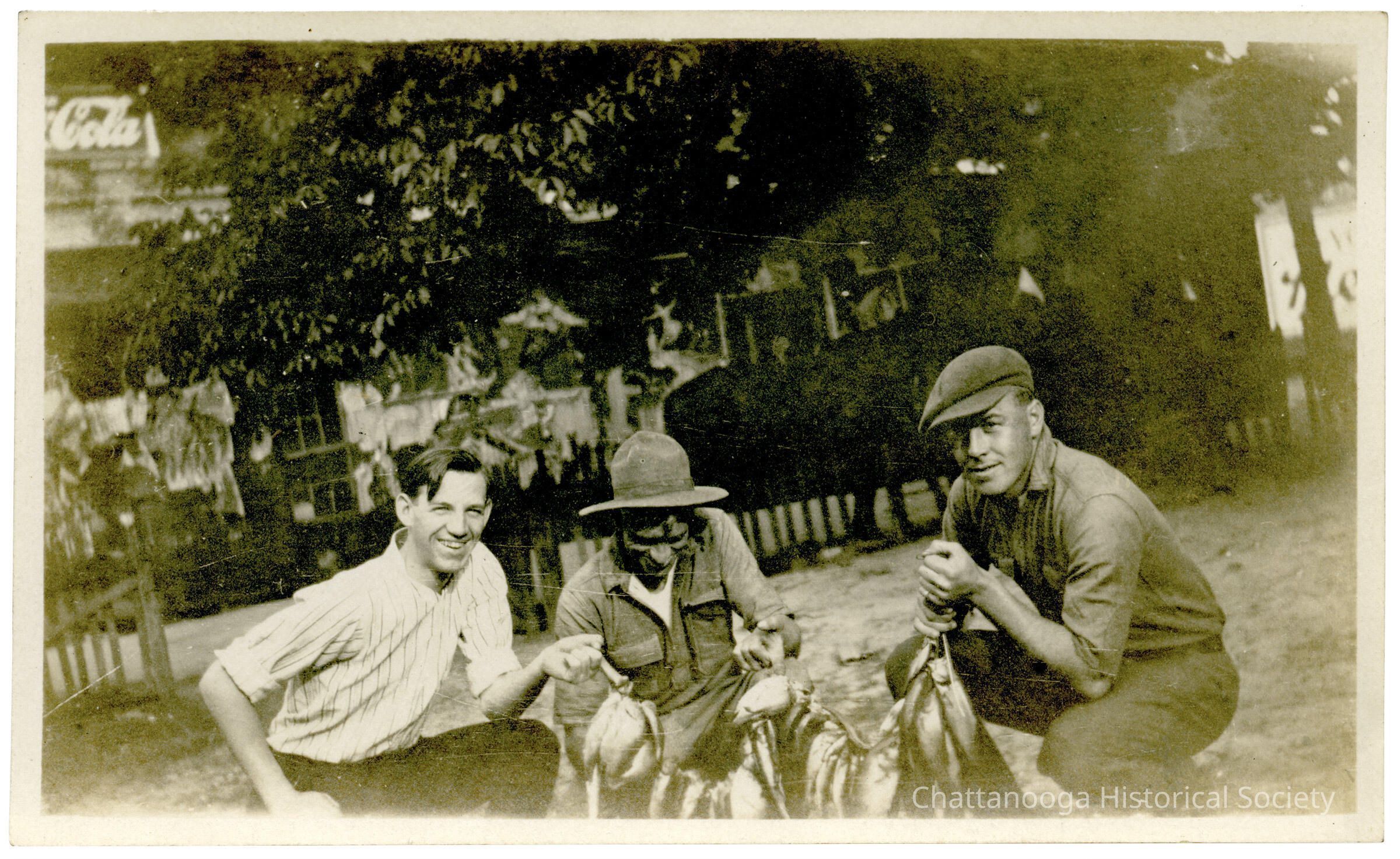 A photograph showing three men holding a string of fish in St. Elmo, Tennessee.Photograph Details
