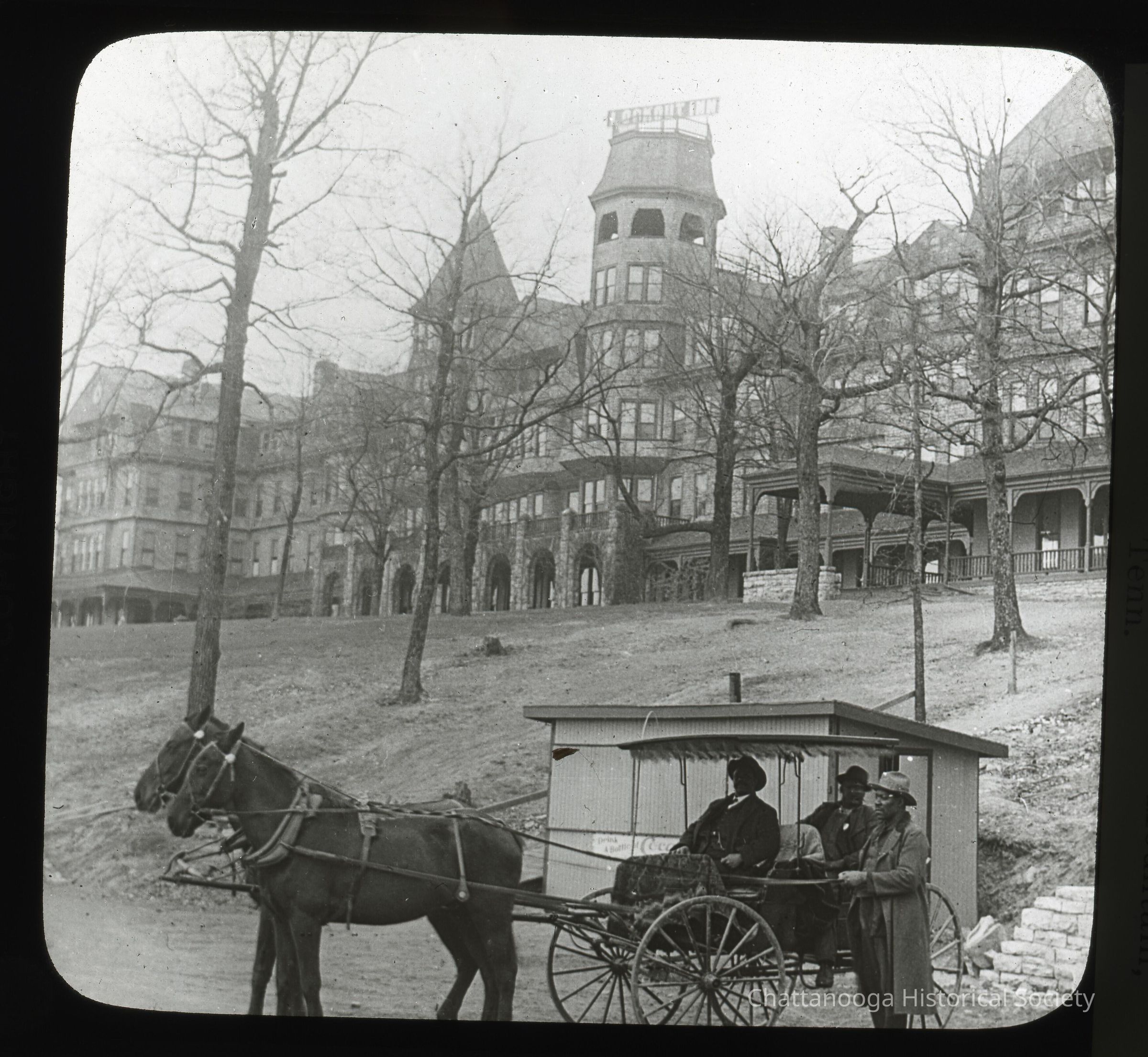 A Keystone View Company glass lantern slide showing three men and a surrey with the Lookout Inn in the background. The view shows two men sitting inside of a surrey with fringe on top as another man stands beside it, holding the reins of the two horses pulling it. The surrey is parked in front of a small stand with a Coca-Cola advertisement on the front. The grand hotel sites behind the conveyance, atop a hill. The hotels main body is at center with its two flanking wings and central five-story tower. A sign above the hipped roof of the tower reads "Lookout Inn".
