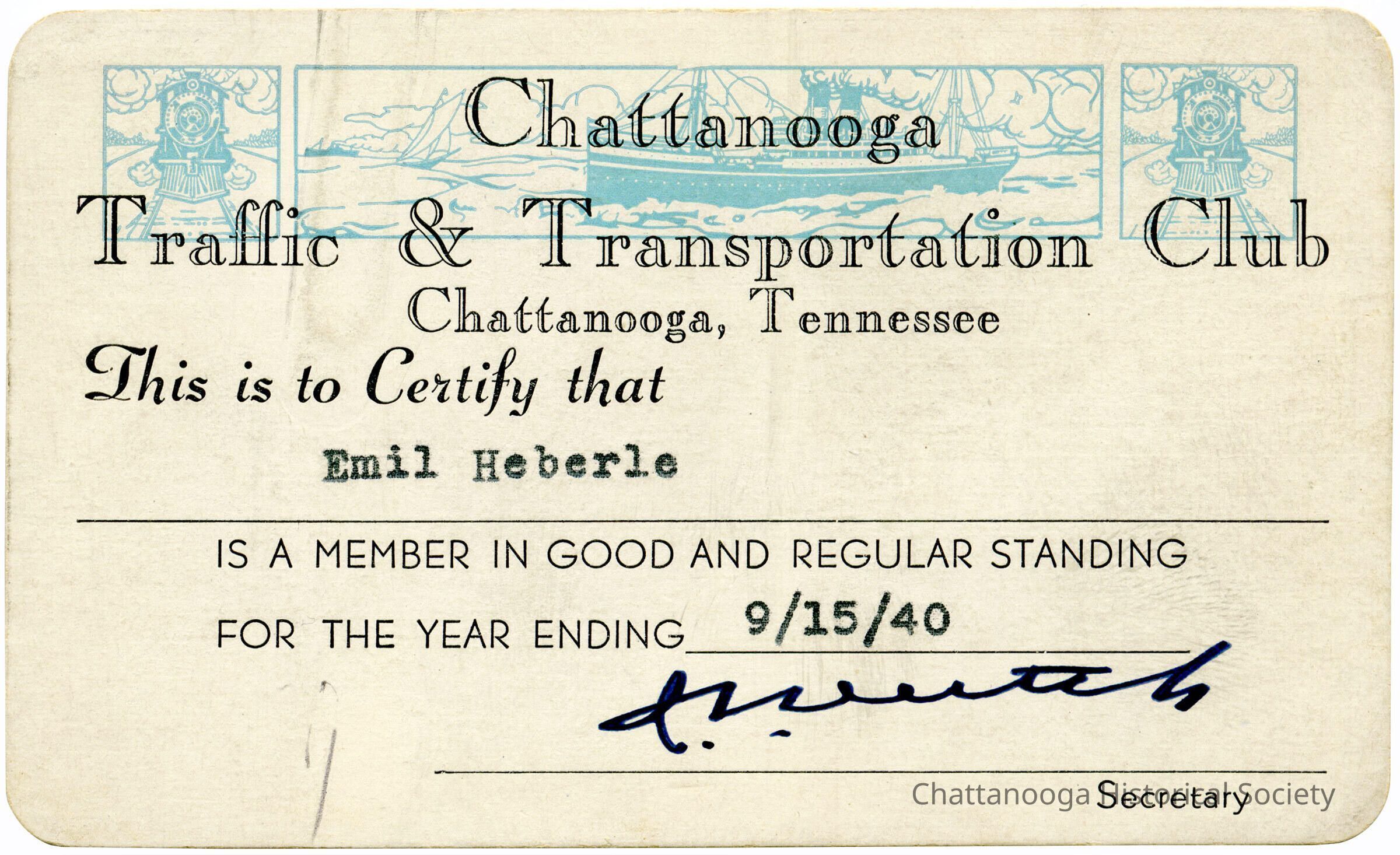 A membership card certifying Emil Heberle as a member of the Chattanooga Traffic and Transportation Club in 1940. The card has rounded edges and illustrations of a train and ship at the top in blue ink.