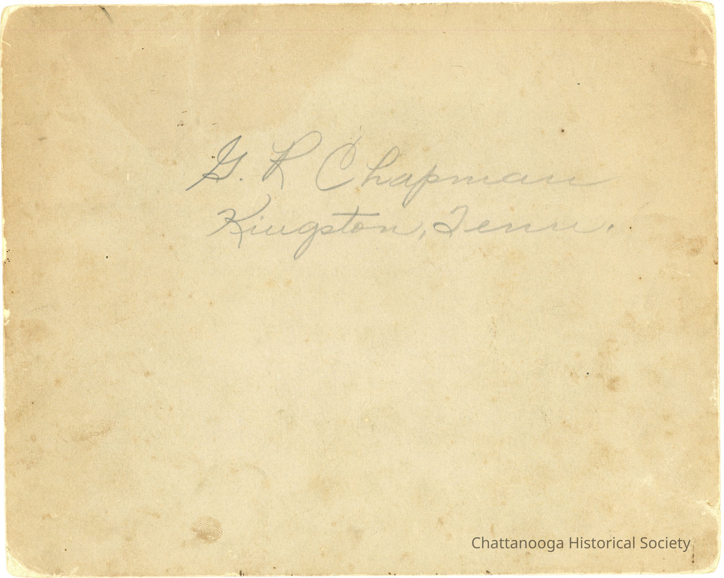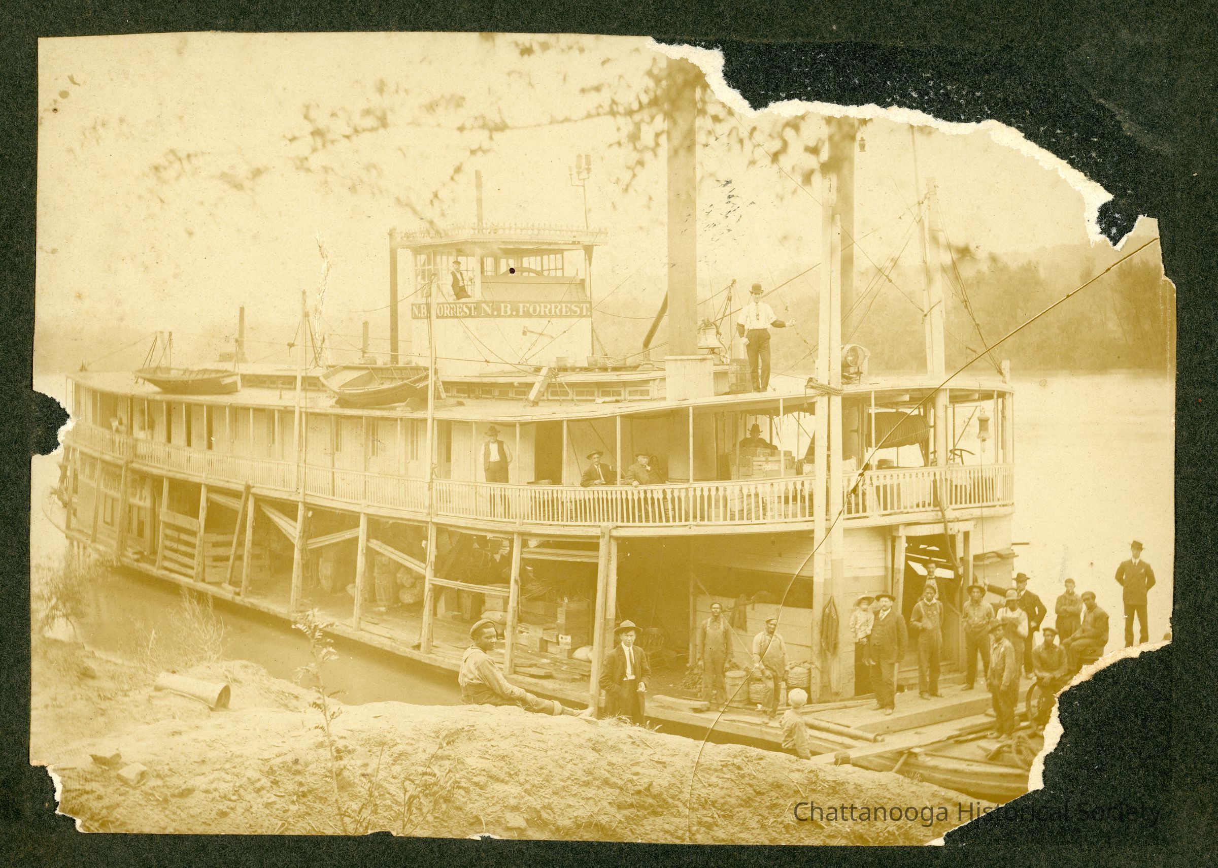 Black and white photograph of the steam packet N.B. Forrest along the banks of the Tennessee River. The photograph shows the packet with a number of people standing on the main and boiler decks as well as on the banks of the river. The deck of the boat shows cargo of boxed goods, barrels, and bales of cotton. The captain of the boat is leaning out of the wheelhouse. The verso reads "G.R. . Chapman | Kingston, Tenn."Photograph Details