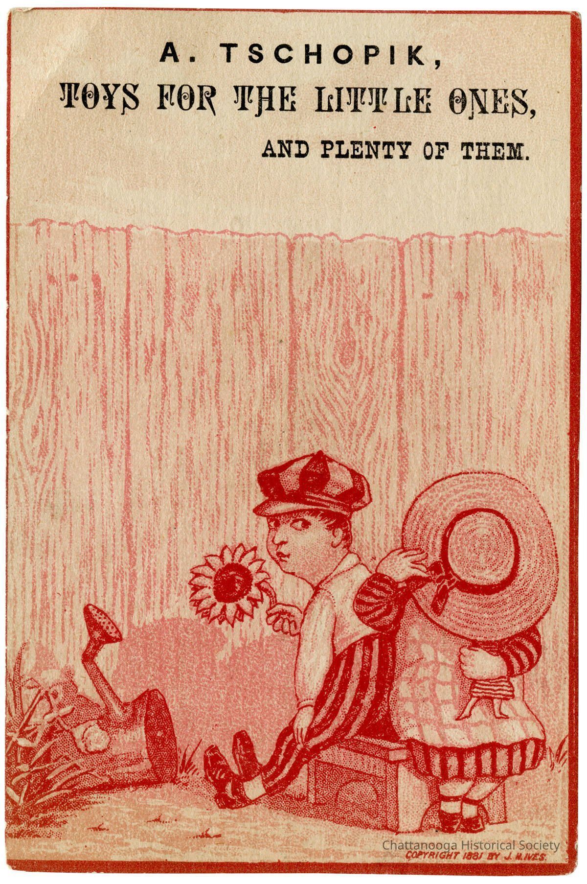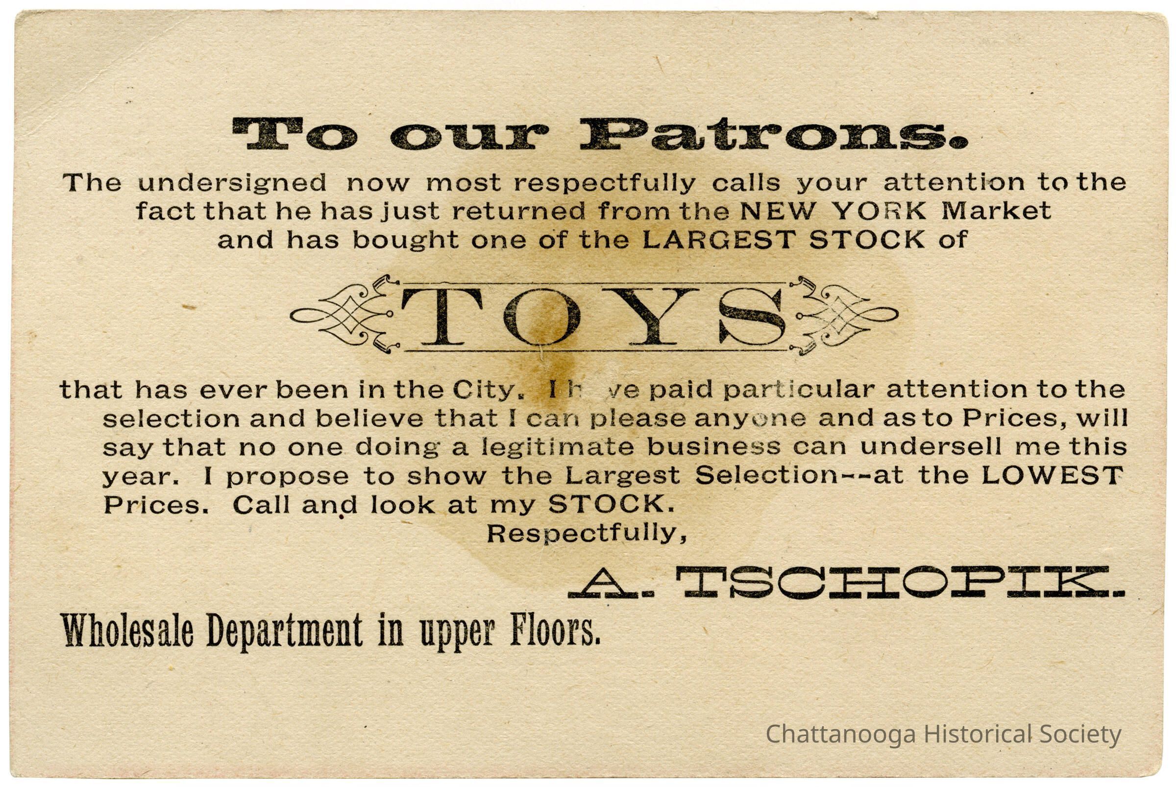 A trade card with an advertisement from A. Tschopik's toy store.