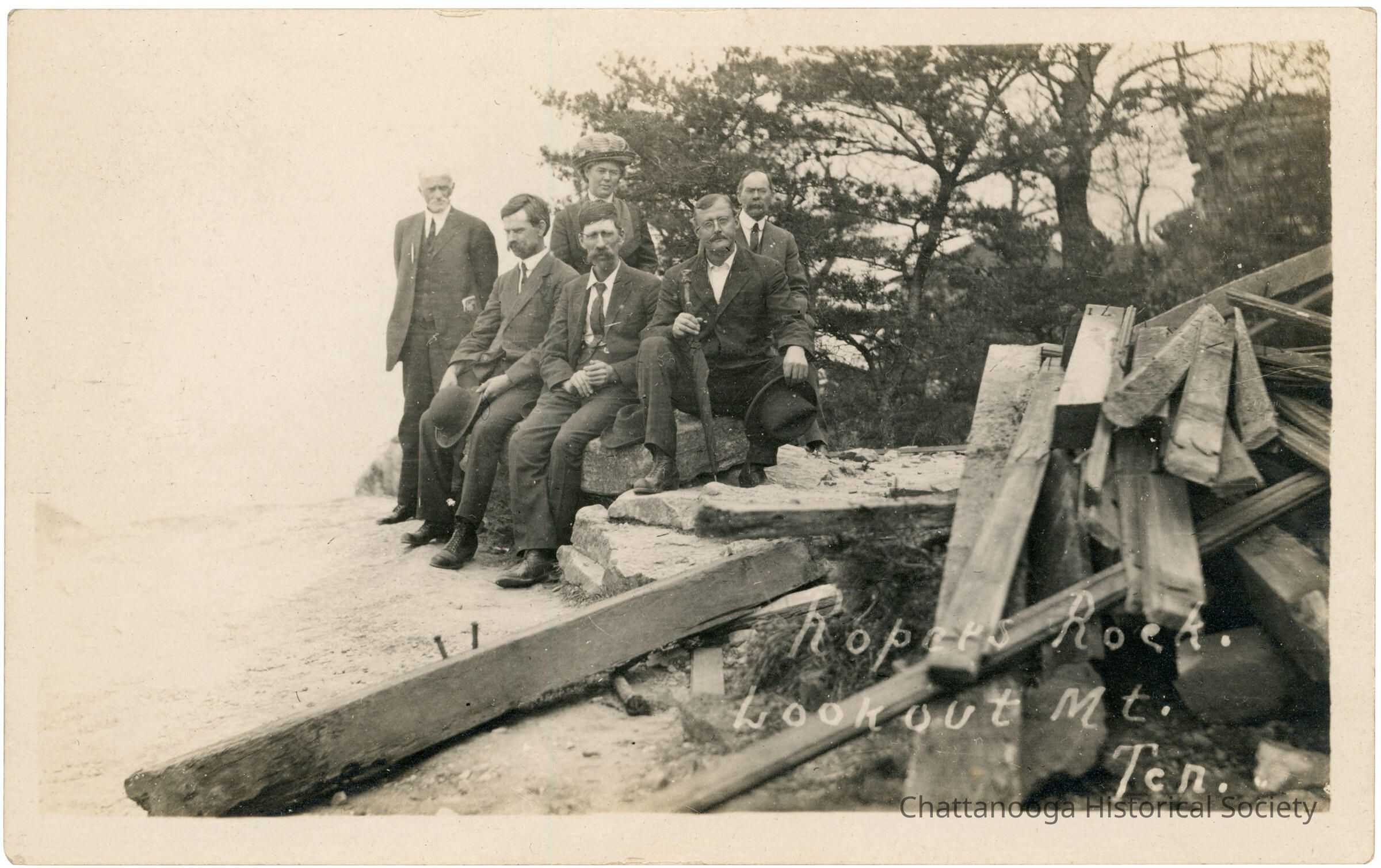 Black and white photographic postcard of a family at Roper Rock on Lookout Mountain, Tennessee. The photograph features five men in dark suits and one woman standing in the rear. Everyone in the photograph appears to be wearing spectacles . Three of the men are sitting on a rock beside the overlook while two men and the woman are standing to the side and behind the rock. There is a pile of used wood in the right foreground of the photograph.Photograph Details