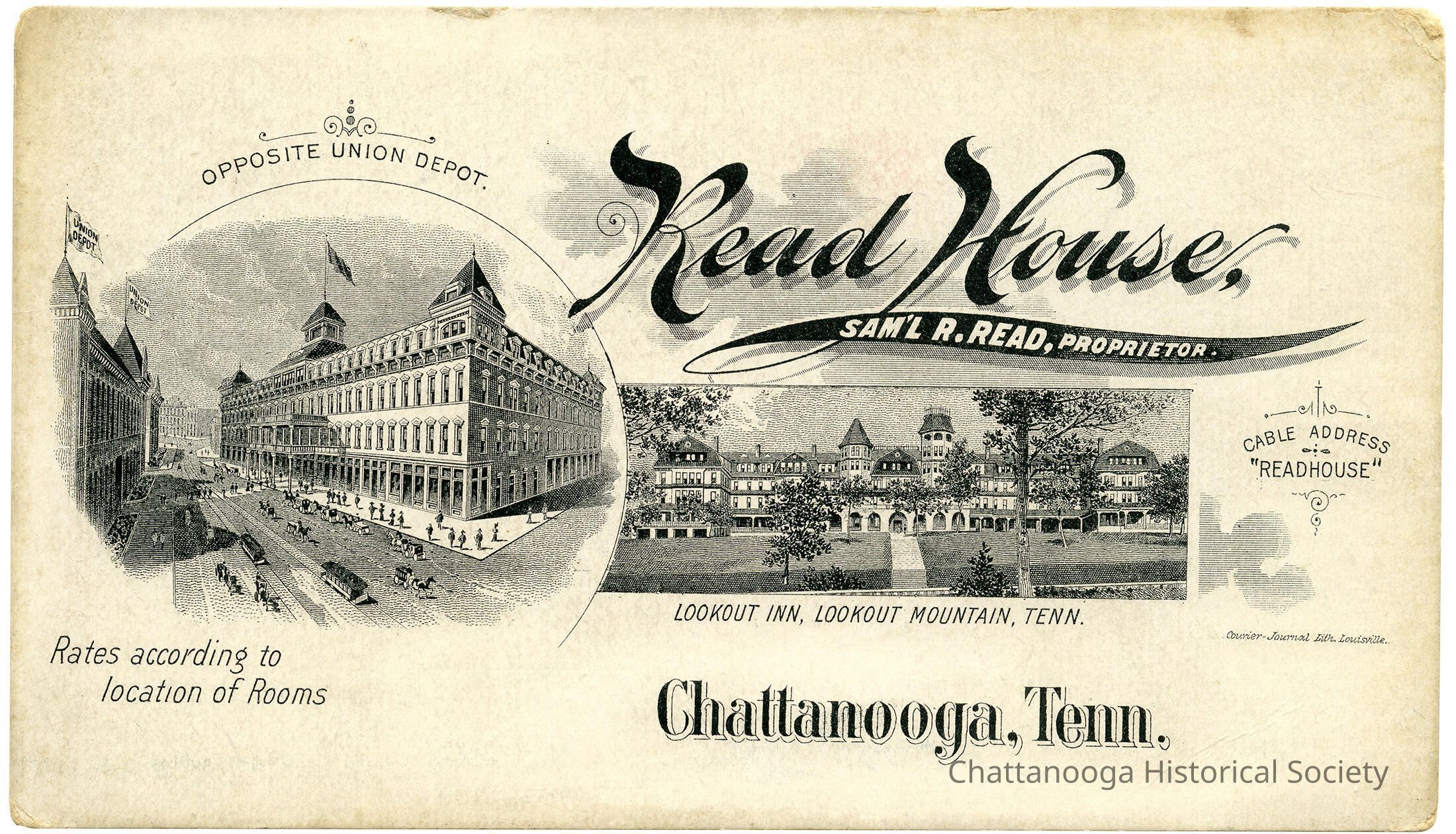 A trade card printed by Courier-Journal Lithograph of Louisville, Kentucky. It advertises the Read House Hotel (opposite Union Depot) in downtown Chattanooga and the Lookout (Mountain) Inn on Lookout Mountain.