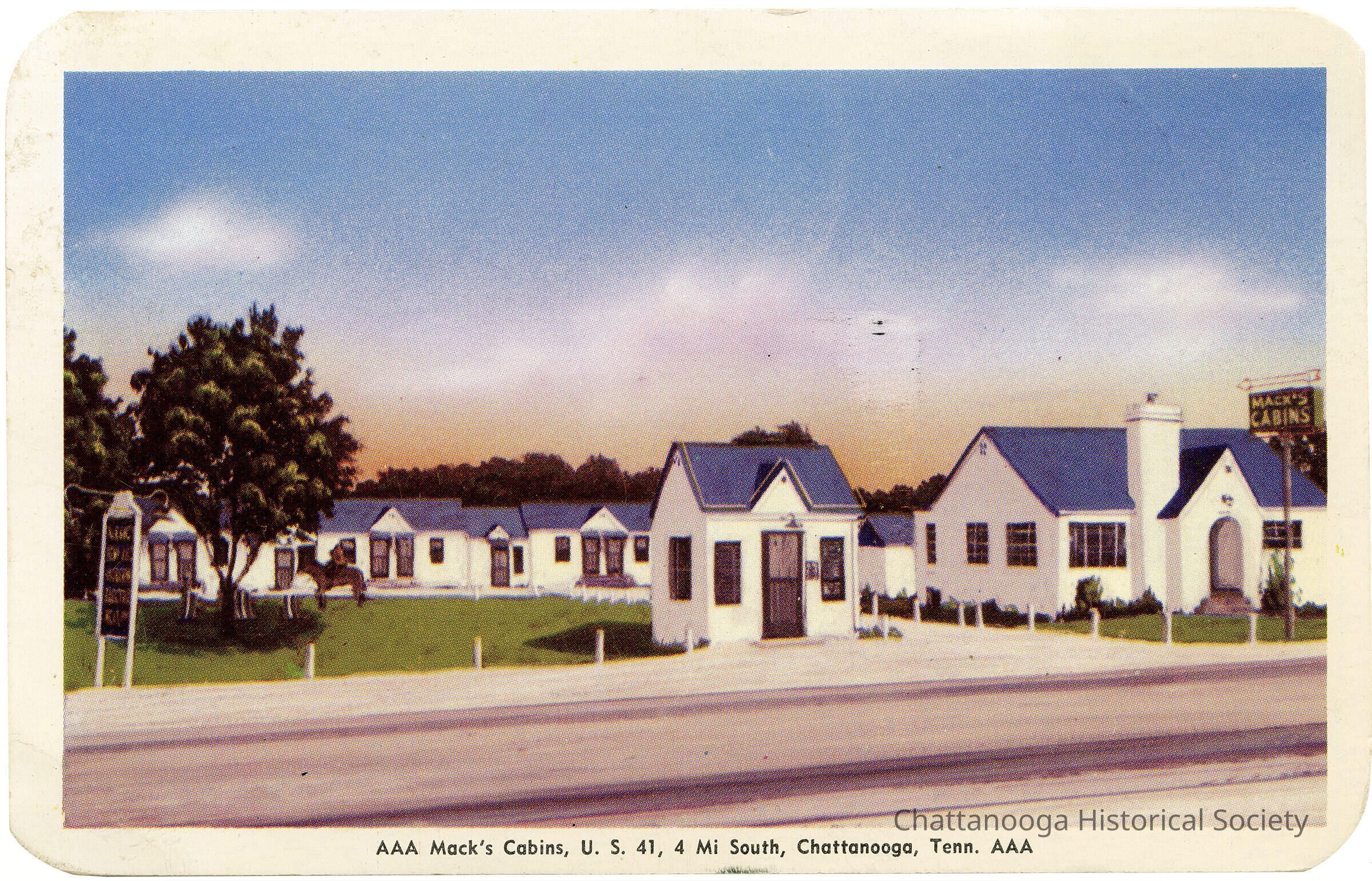 A postcard with the front showing an illustration of the AAA Mack's Cabins near Chattanooga, owned and operated by Mr. and Mrs. Floyd McKeel. The motel features a series of attached white "cabins" in a row behind the main office/house.