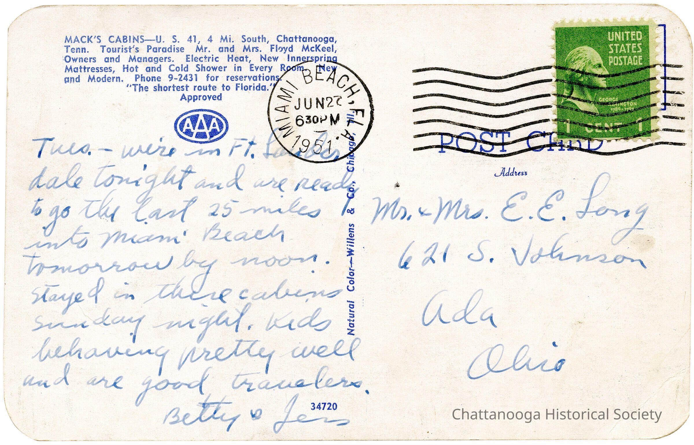 The rear reads "MACK'S CABINS—U. S. 41, 4 Mi. South, Chattanooga, Tenn. Tourist's Paradise Mr. and Mrs. Floyd McKeel, Owners and Managers. Electric Heat, New Innerspring Mattresses, Hot and Cold Shower in Every Room and Modern. Phone 9-2431 for reservations, "The shortest route to Florida." Approved AAA"Subject Person/Organization