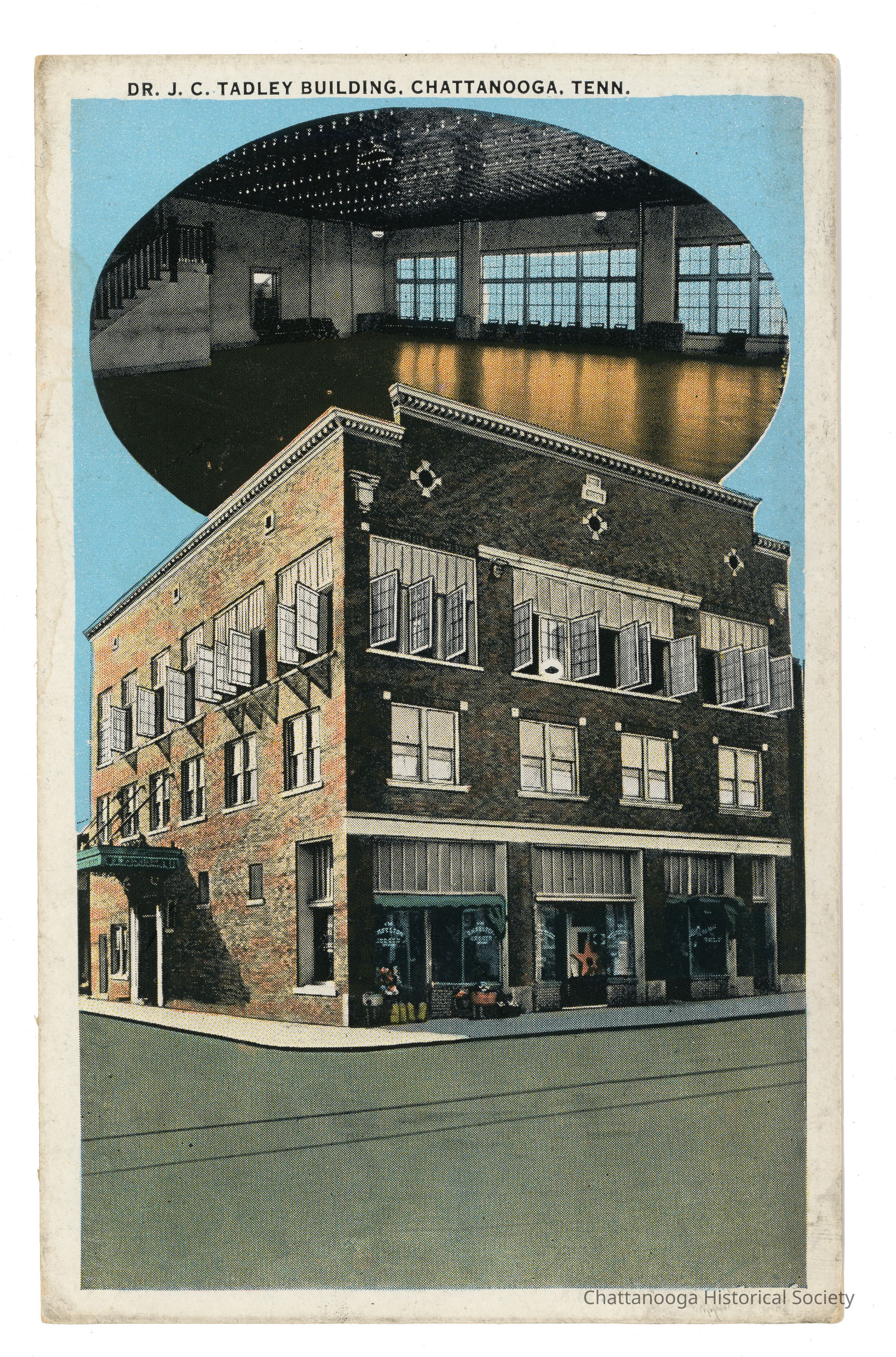 A halftone printed postcard showing the Dr. J.C. Tadley Building. The postcard shows a three-story brick building with decorative scuppers at the parapet and three bays on the first floor where various businesses. Other businesses and offices occupied the second floors and a dance hall was on the third. In 1928 when the office building opened, these businesses included Jimmie Edwards' Tailor Shop, Melody Music Shop (D.E. Lewis, prop), Dentist Dr. J. Monroe Bynes, and the Silver Slipper Garden. The dance hall was managed by Glenn Hawkins and was opened twice a week with performances by Duconge's Silver Tone Orchestra.