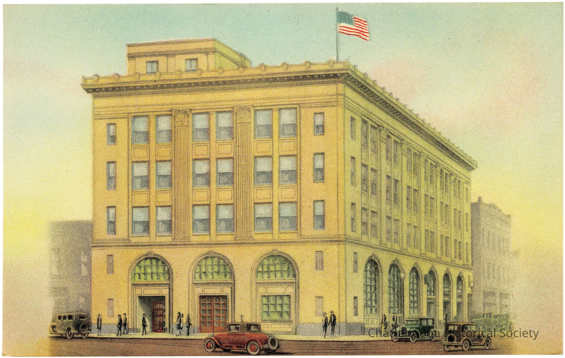 A postcard with the front showing an illustration of the Main Street branch of the Hamilton National Bank at Market and Main Streets in Chattanooga, Tennessee. The verso advertising text reads "The new Home of the MAIN STREET BRANCH HAMILTON NATIONAL BANK Main and Market Streets Chattanooga, Tennessee