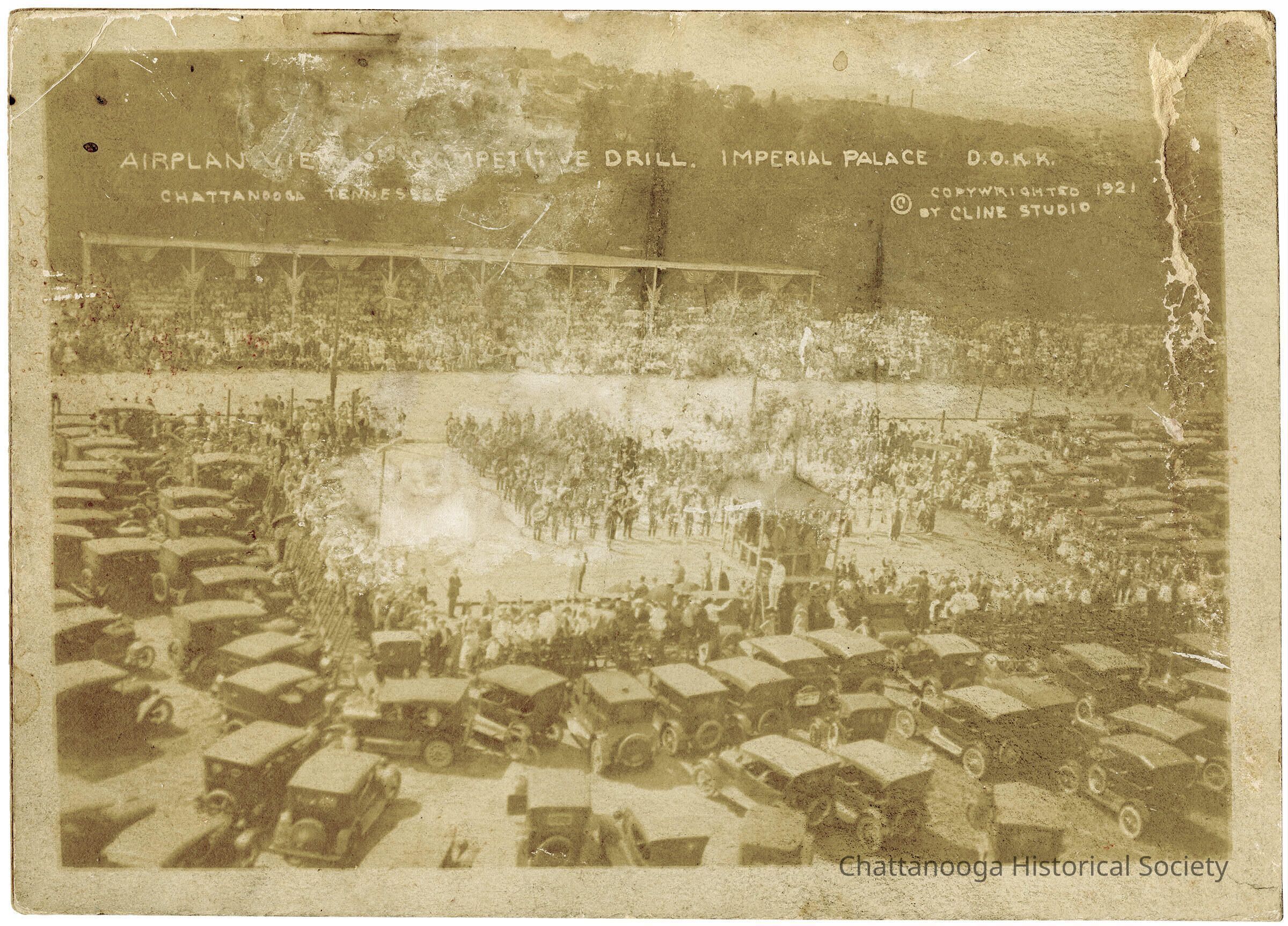 Black and white aerial photograph of marching band competitive drilling as a part of the Dramatic Order of the Knights of Khorassan. The marchers are at center with a large grandstand bedecked with American flag swag on one side and a observation tower that sits at the center of a u-shaped formation of stands. The stands are surrounded by rows of automobiles. The photograph's negative was marked "Airplane View of Competitive Drill. Imperial Palace D.O.K.K. Copywrighted 1921 By Cline Studio.