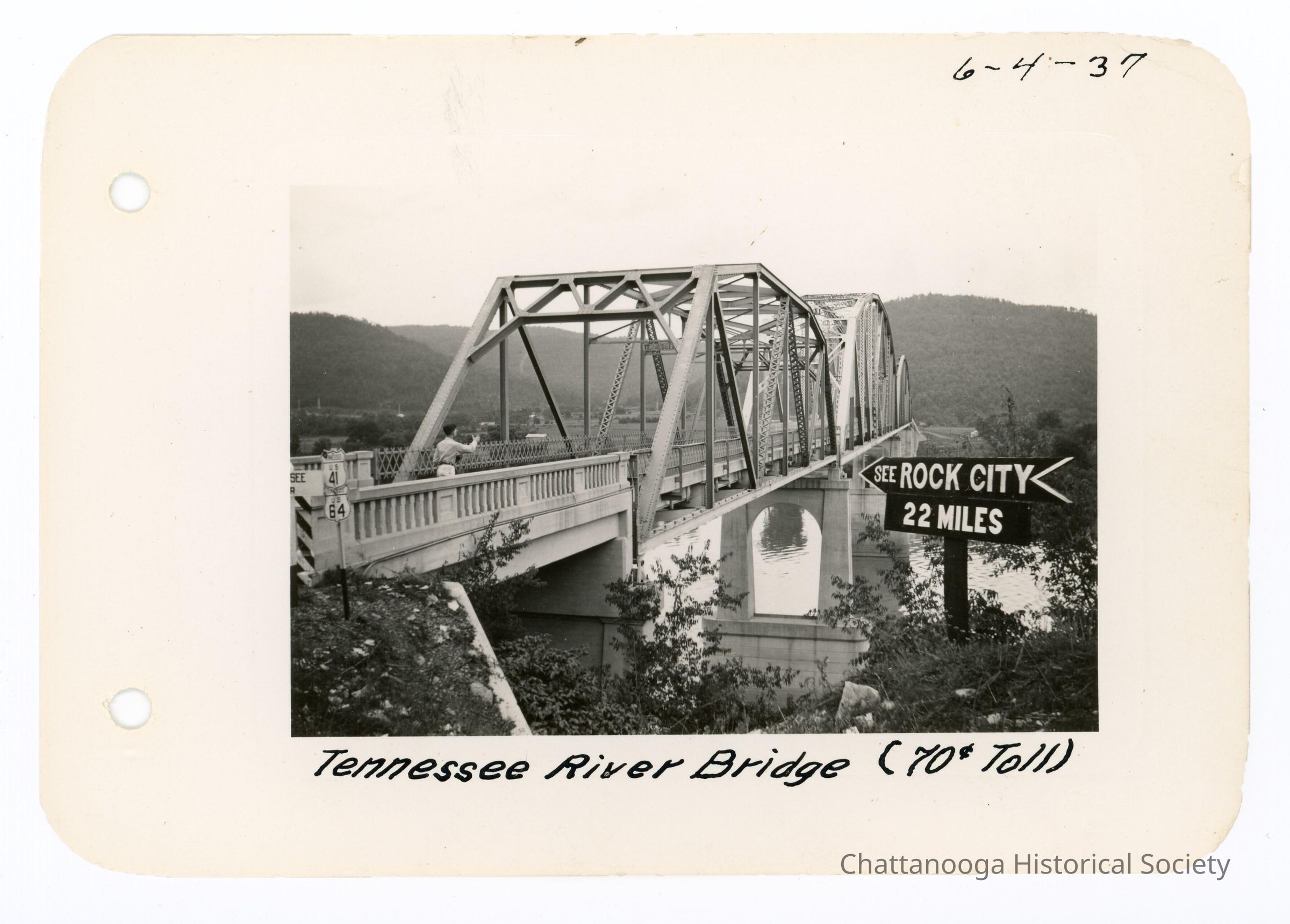 Black and white photograph showing a steel trestle bridge spanning the Tennessee River and Nickajack Lake (Highway US 41) in Marion County, Tennessee. A black and white directional sign reads "See ROCK CITY 22 Miles" and pointing across the bridge. There is a man standing on the bridge deck looking to the other side. The photograph is labelled "Tennessee River Bridge (70c Toll)" and is dated 6-4-37. The bridge was demolished in 2015.Date(s) of Creation