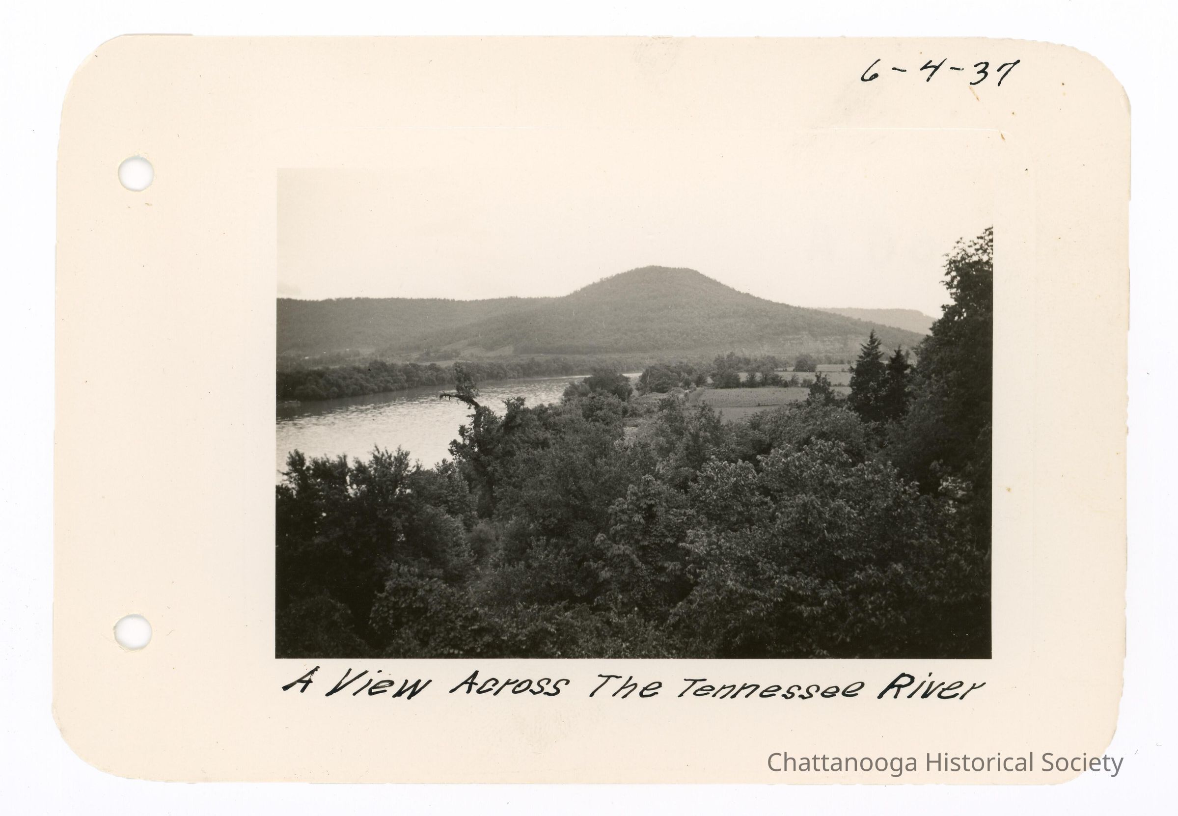Black and white photograph showing a view of the Tennessee River. The photograph is labelled "A View Across The Tennessee River" and is dated 6-4-37.Date(s) of Creation