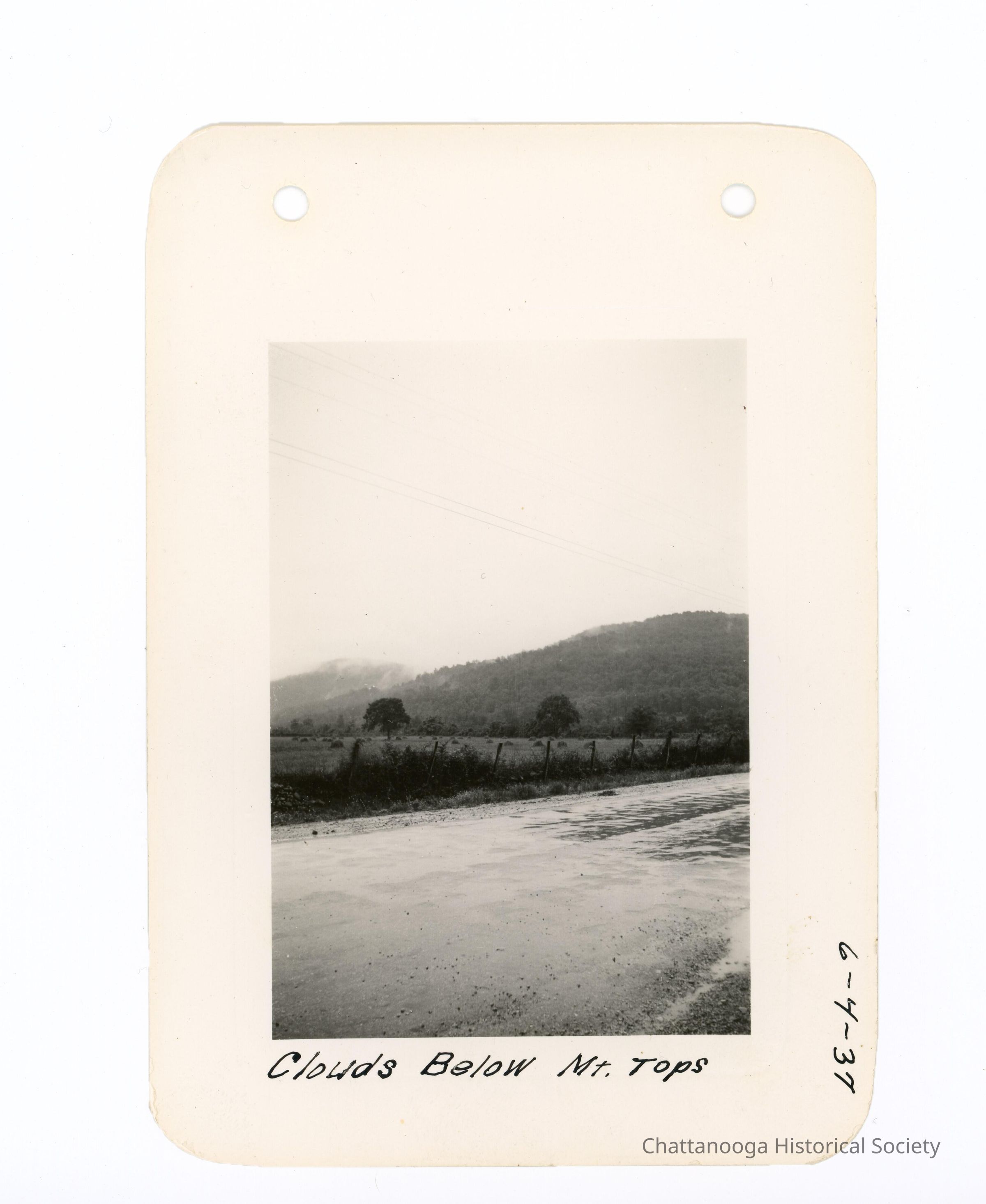 Black and white photograph of cloudy mountains behind a wet road. There is a fenced field in the mid ground and what is likely the Cumberland Mountains appear in the background. The photograph is labelled "Clouds Below Mt. Tops" and is dated 6-4-37.Date(s) of Creation
