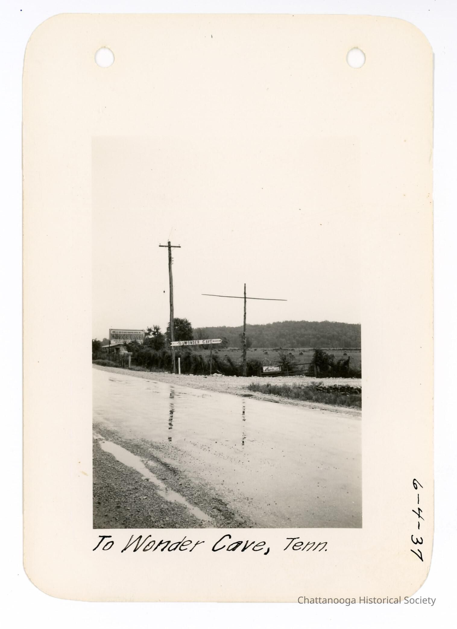 Black and white photograph of roadside signs for the Wonder Cave. The snapshot shows a wet gravel road with three advertising signs along the side. One sign, sitting on a gate, advertises "Dr. Pepper" with a graphic of a soda bottle. The other signs advertise Wonder Cave, which is a natural cave in Grundy County, Tennessee visited by tourists from 1800s to early 2000s. One directional sign points down the road "To Wonder Cave". The larger sign further up the road reads "Wonder Cave". The photograph is labelled "To Wonder Cave, Tenn." and is dated 6-4-1937.Date(s) of Creation