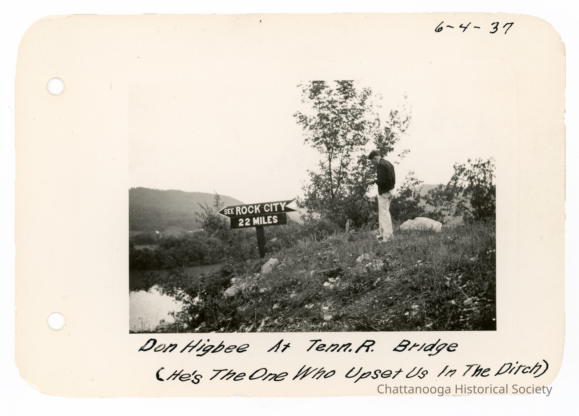 Black and white photograph showing a man looking down at a directional sign reading "See ROCK CITY 22 Miles". The Tennessee River is below the sign, to the right. The photograph is labelled "Don Higbee At Tenn. R. Bridge (He's The One Who Upset Us In The Ditch)" and is date 6-4-37.Date(s) of Creation