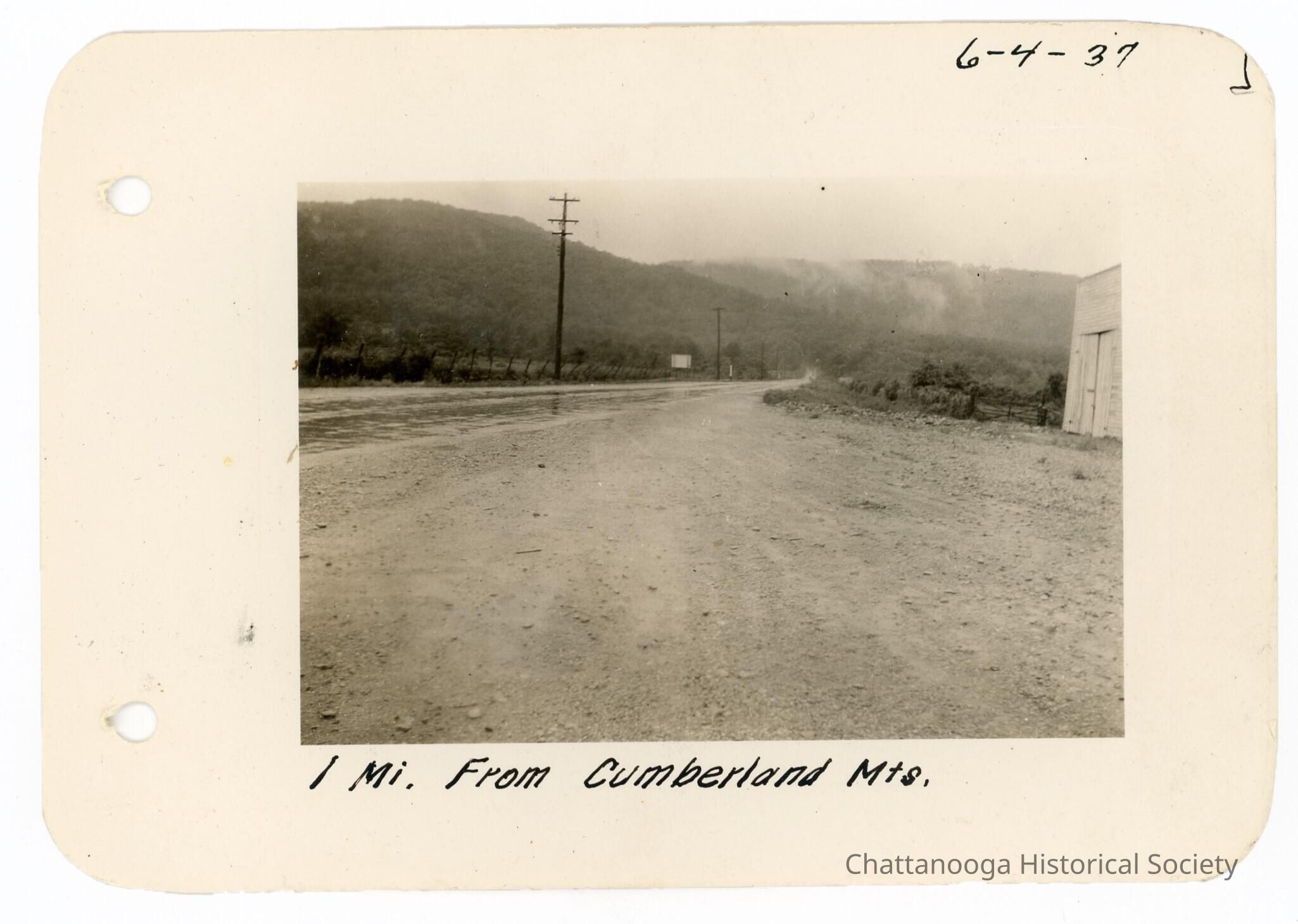 Black and white photograph showing a dirt road leading up into mountains. There is a white barn-like structure in the right mid-ground of the photograph. The photograph is labelled "1 Mi. From Cumberland Mts." and is dated 6-4-37.Date(s) of Creation