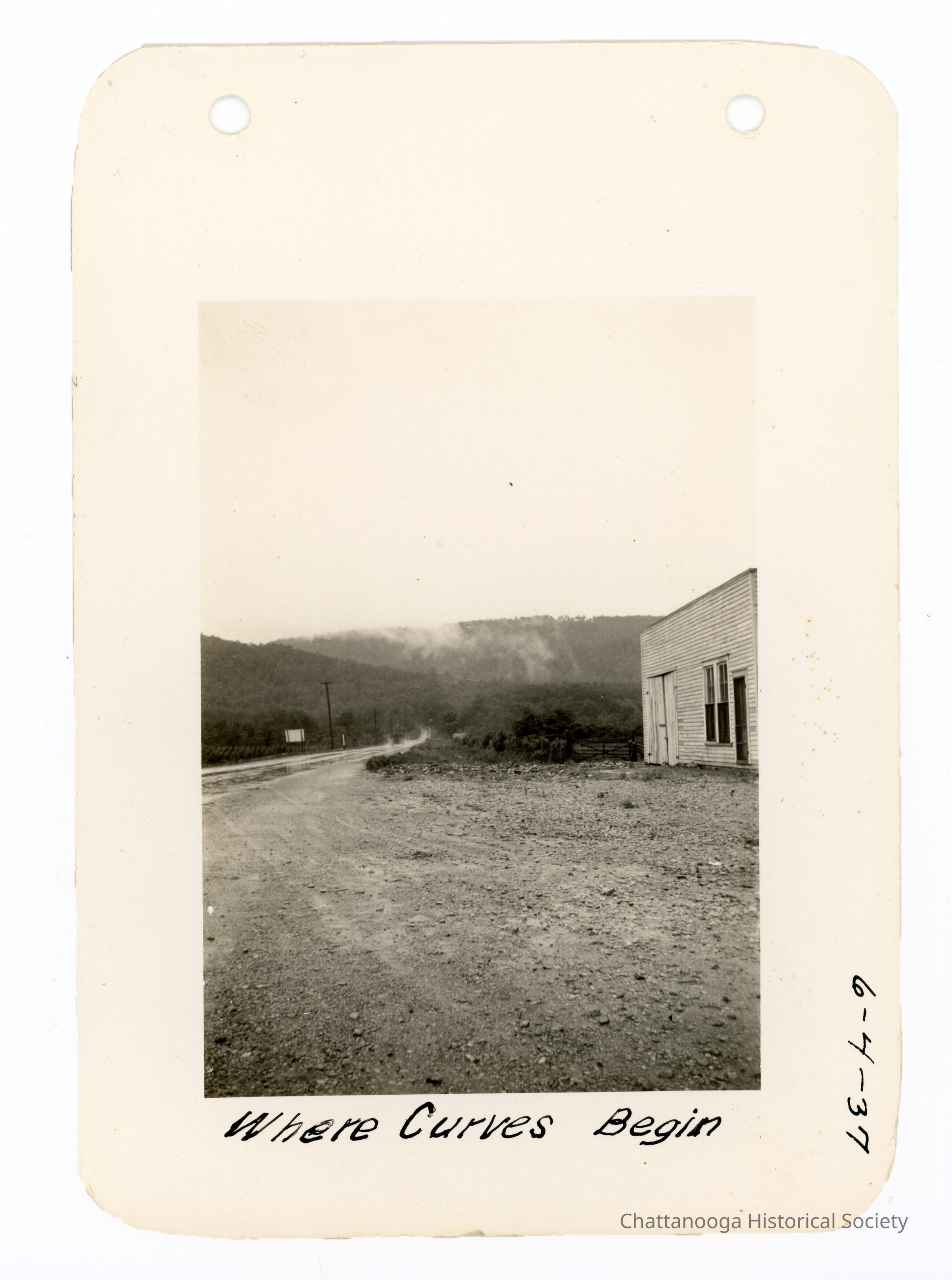 Black and white photograph of the same road in photograph 2021.039.003 A. The photograph shows more detail of the wooden structure on the right. The photograph is labelled "Where Curves Begin" and is dated 6-4-37.Date(s) of Creation