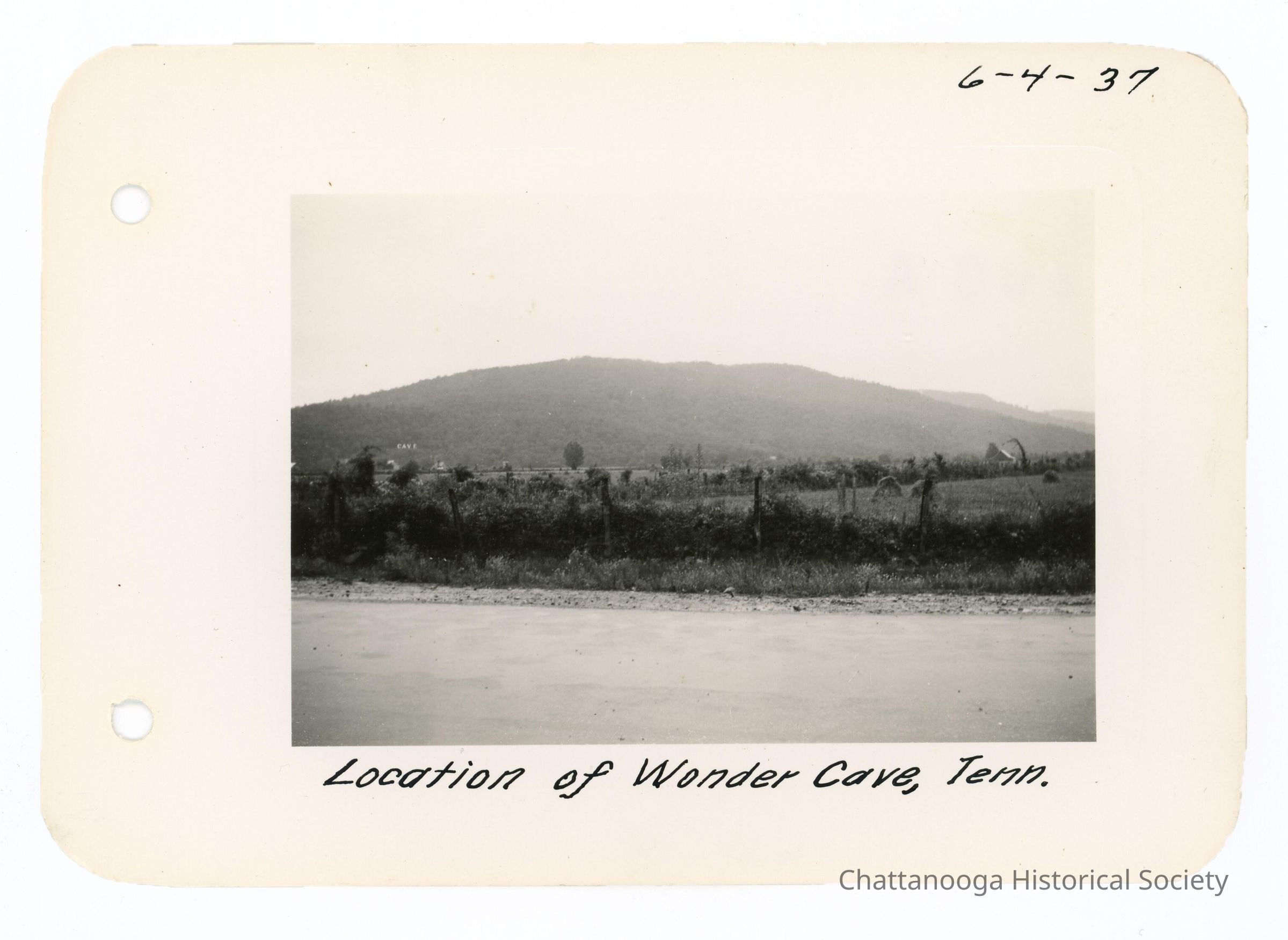 Black and white photograph from the road showing the location of the cave within the Cumberland Plateau. The road site in the foreground of the snapshot with a field with grazing animals in the midground. The Cumberland's can be seen in the background with a light sign reading "Cave" seen to the left. The photograph is labelled "Location of Wonder Cave, Tenn." and is dated 6-4-37.Date(s) of Creation