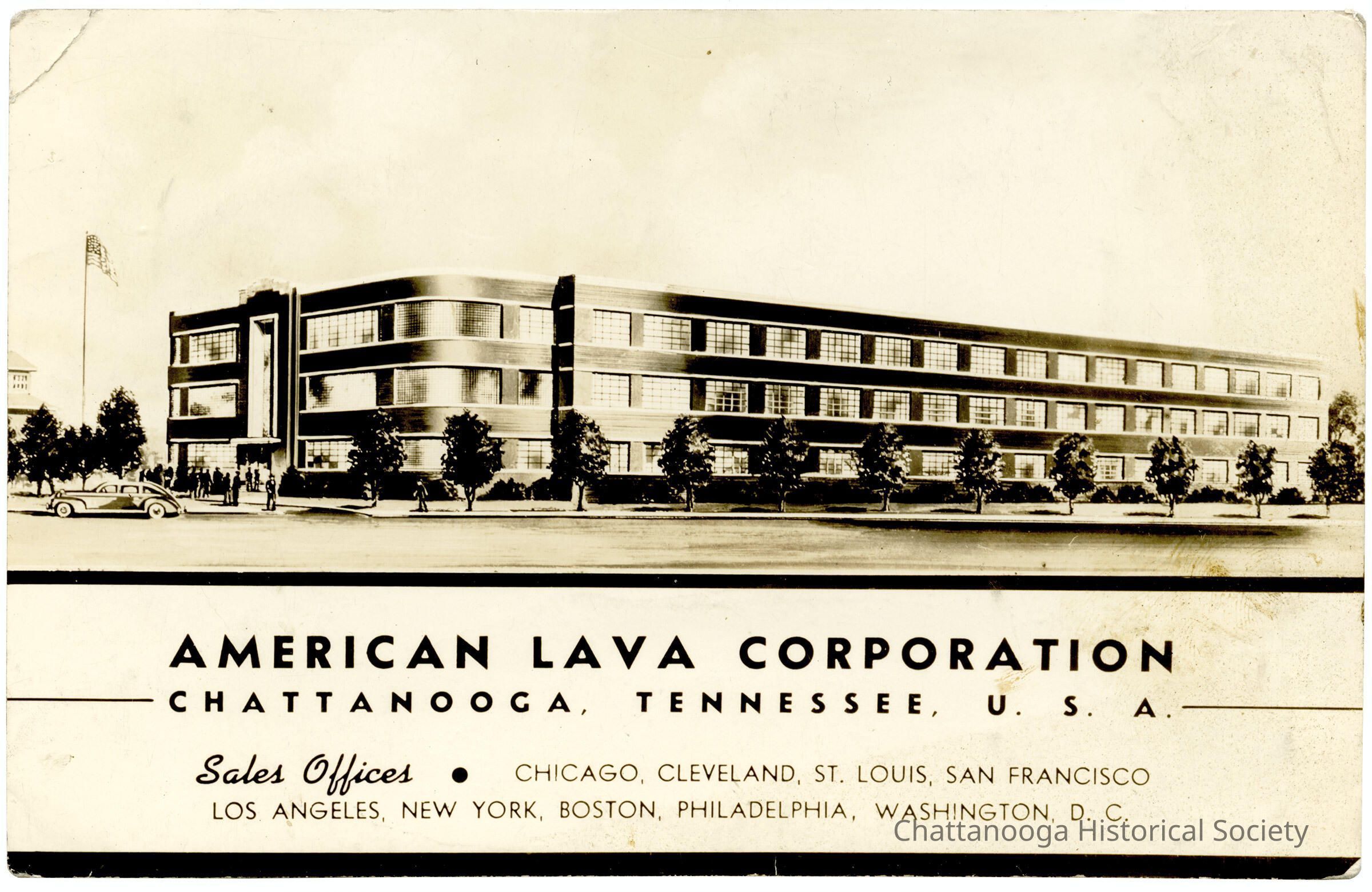 A postcard with the front showing an illustration of the headquarters of American Lava Corporation at 100 Cherokee Blvd., Chattanooga, Tennessee.