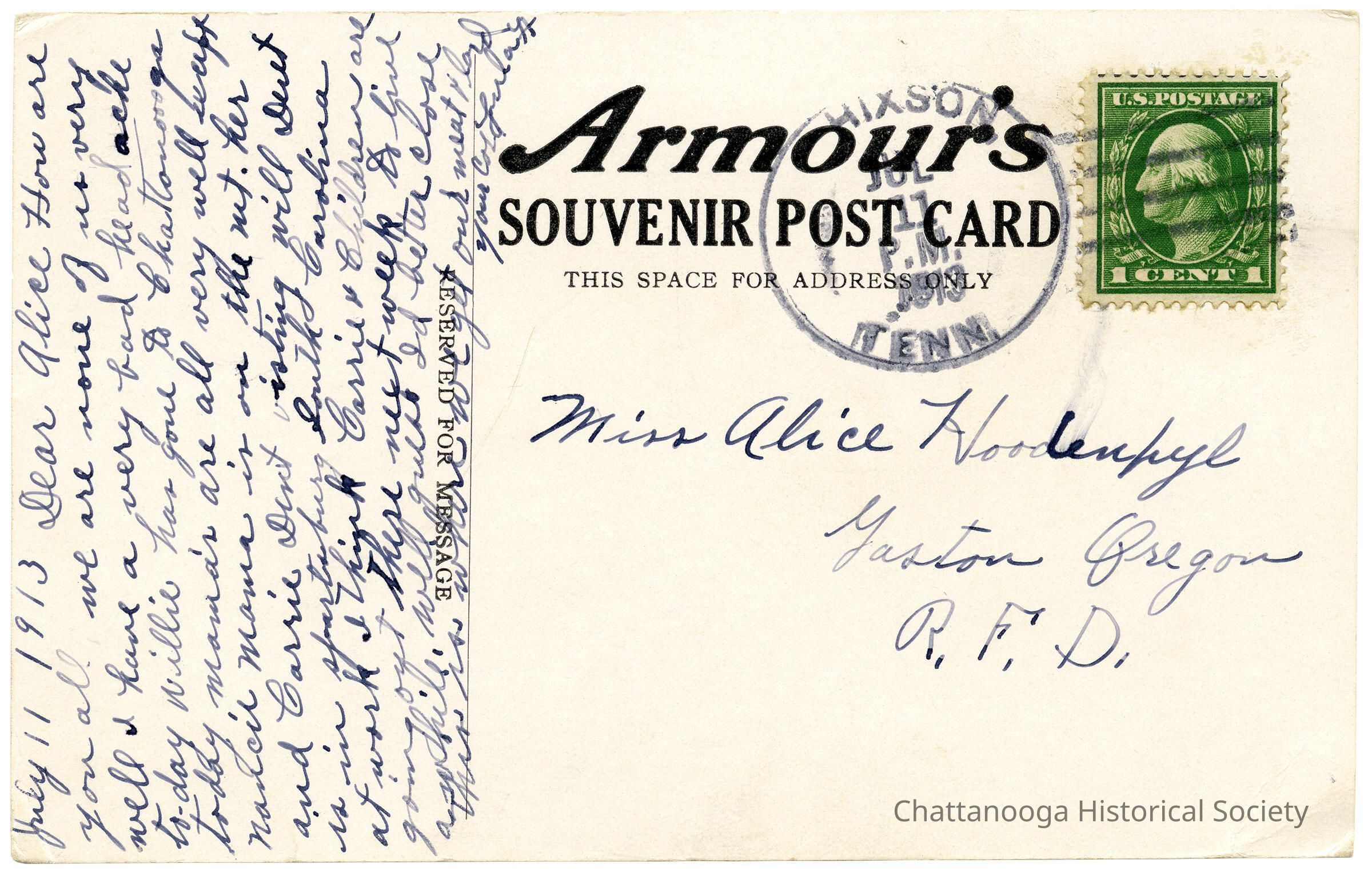 A souvenir postcard with the front showing the new branch house of Armour and Company, located at West 14th and Cowart Streets.