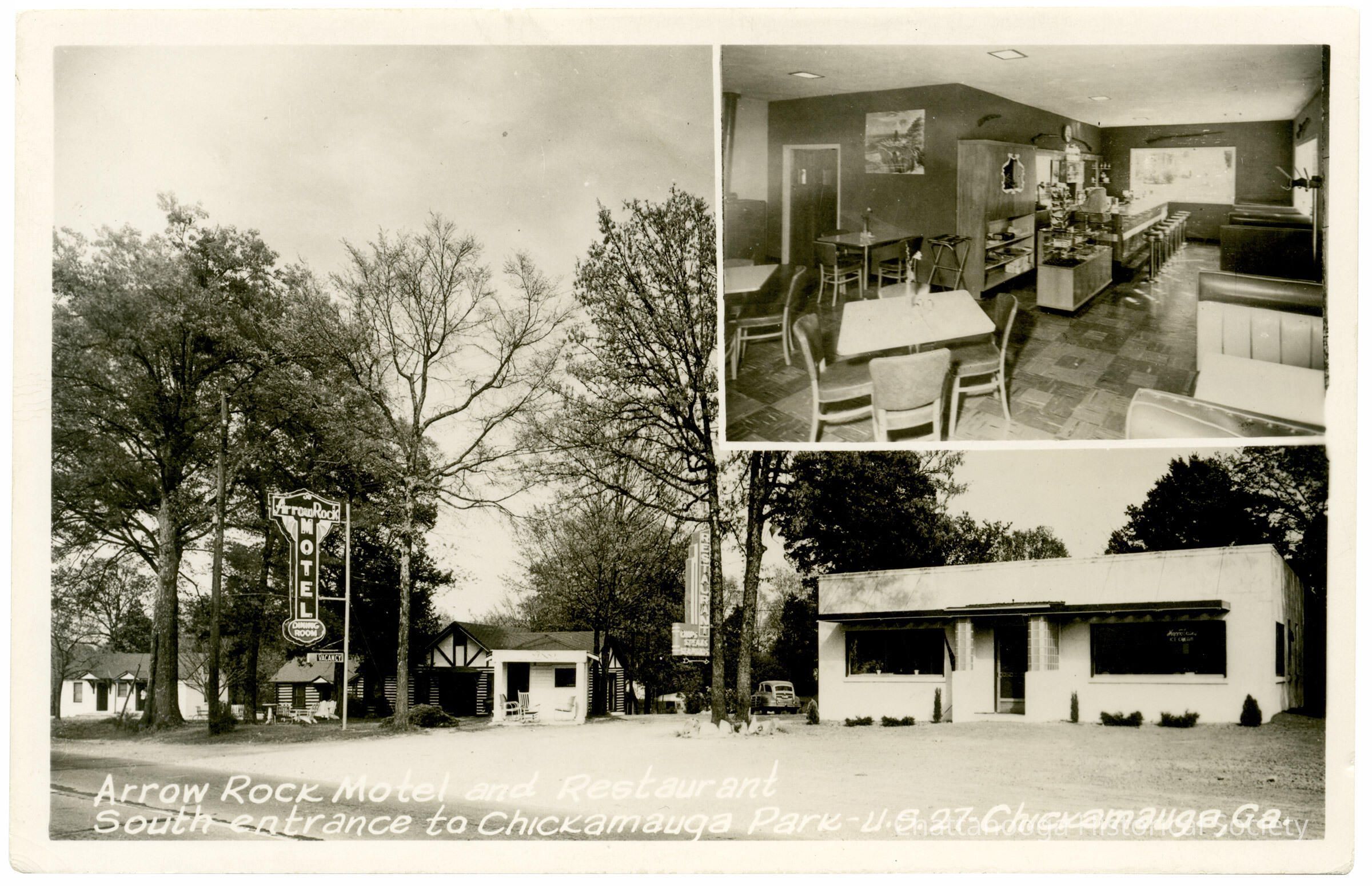 A photographic postcard with the front showing photographs of the exterior restaurant and motel cabins and an inset photograph of the interior dining room of the Arrow Rock Motel and Restaurant in Chickamauga, Georgia at the south entrance to the Chickamauga and Chattanooga National Military Park, U.S. 27.Subject Person/Organization