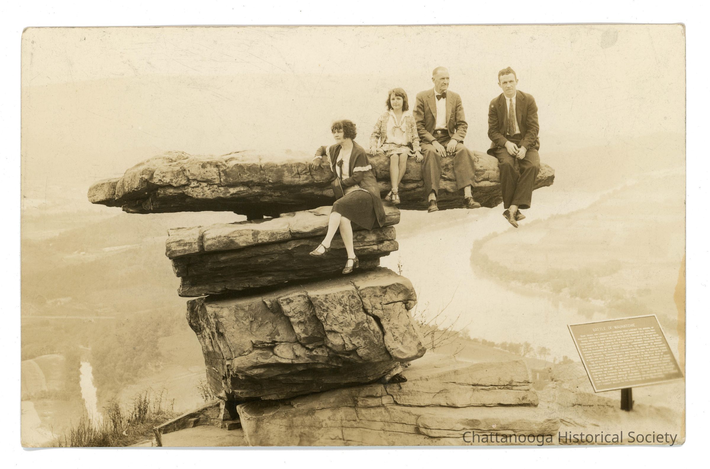 A black and white photograph developed on postcard paper showing a family on Umbrella Rock on Lookout Mountain, Tennessee. The photograph shows three people, a younger girl and two men, on the top of the formation with a woman seated on the ledge below. The Tennessee River and Moccasin bend can be seen in the background as well as an interpretive sign for the Battle of Wauhatchie.