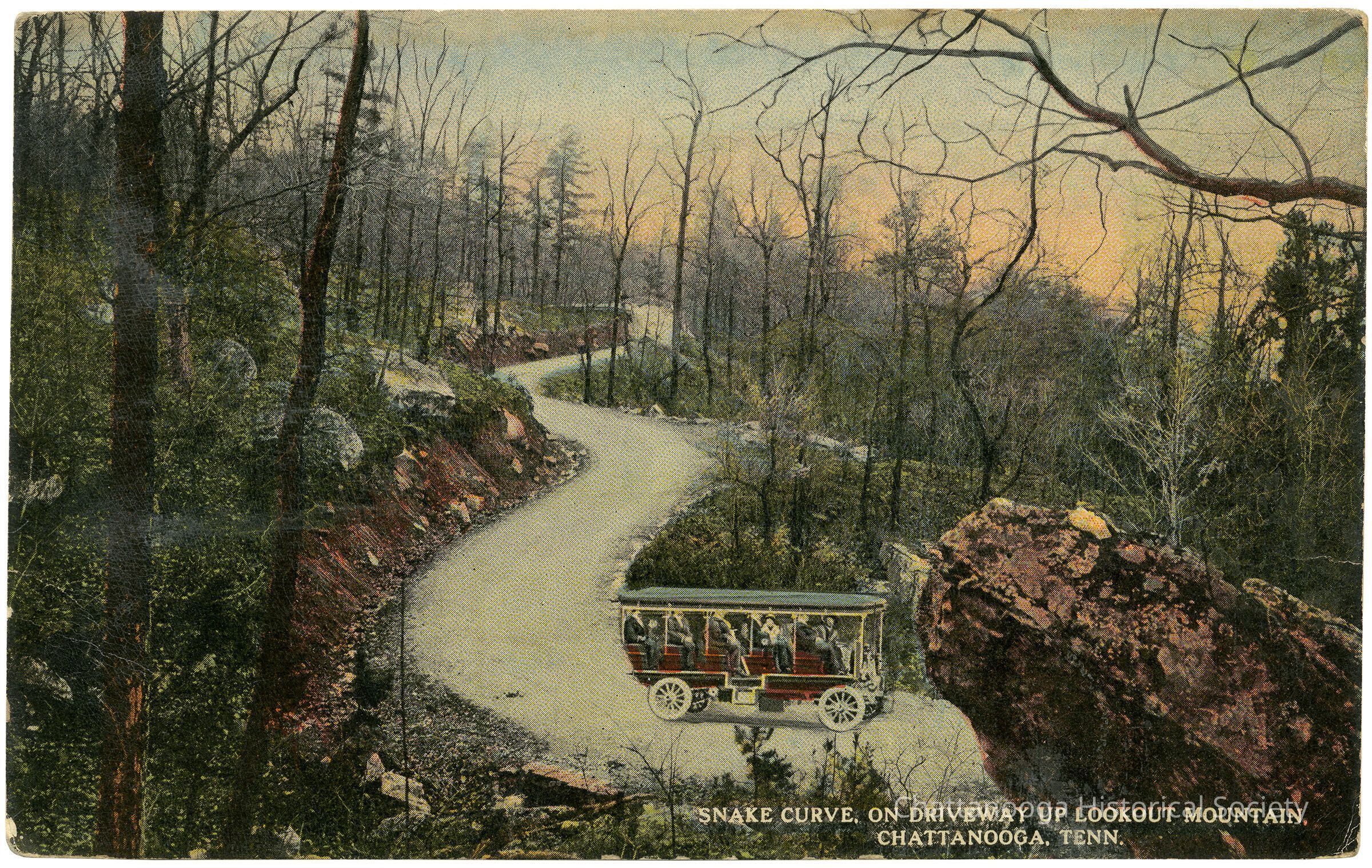 A postcard with the front showing a color-tinted photograph with a superimposed tourist vehicle on the snake curve on the driveway up Lookout Mountain, Tennessee.