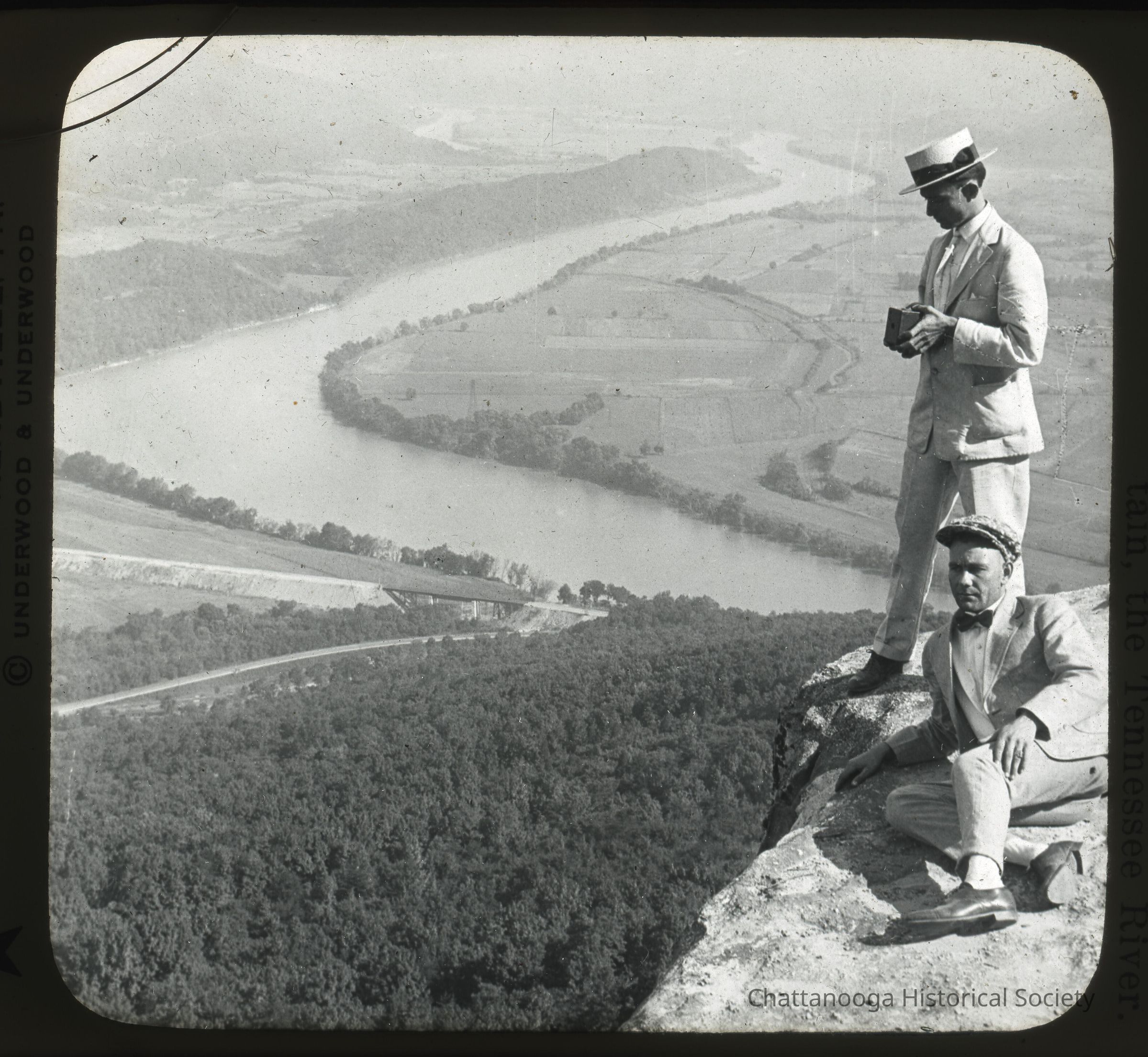 A Keystone View Company glass lantern slide showing the view from Lookout Mountain and the Tennessee River. The view shows two men along the edge of Sunset Rock. One man is reclining on the rock formation at bottom right. He is wearing a light colored suit with a bow tie and a six-panel cap. A second man is standing behind him in a similar outfit but he is wearing a white tie and a boater hat. The man is also holding a Kodak Brownie or similar box camera. The Tennessee River can be seen behind them as well as the farmland on Moccasin Bend. The road seen towards the bottom of the view is likely the Wauhatchi Pike.