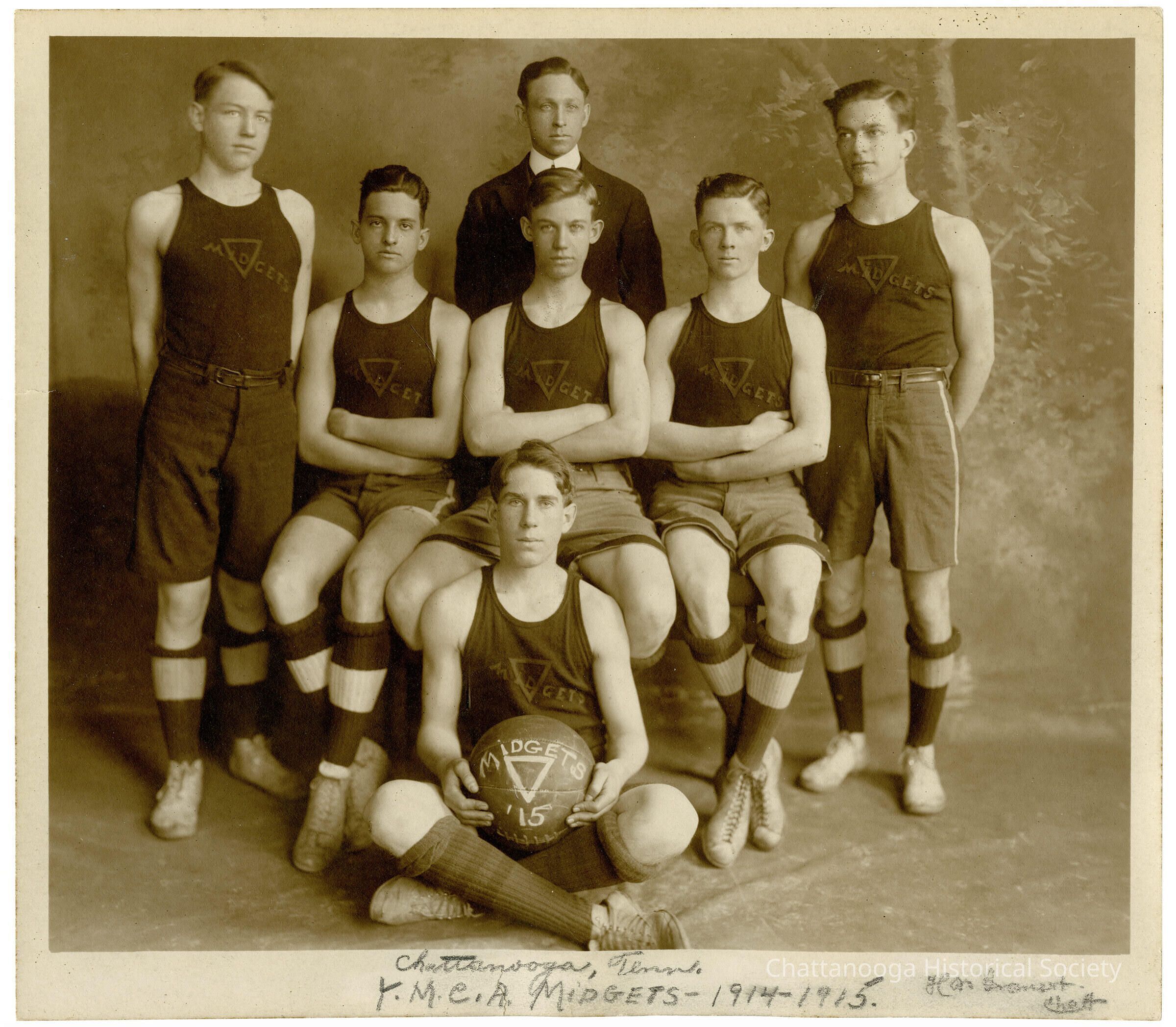 A studio portrait featuring the 1914-1915 Chattanooga Y. M. C. A. "Midgets" basketball team.There are three rows of men, with one man sitting at center, holding a basketball that says "Midgets '15". Their uniforms have a triangle with Midgets written centered across their chest. Written underneath the photo is "Chattanooga, Tenn., Y.M.C.A. Midgets - 1914-1915. "Photograph Details