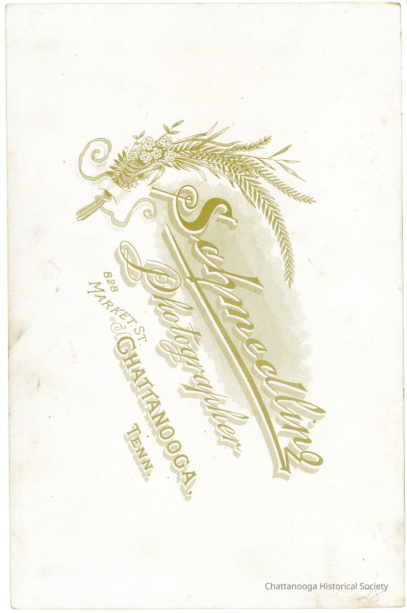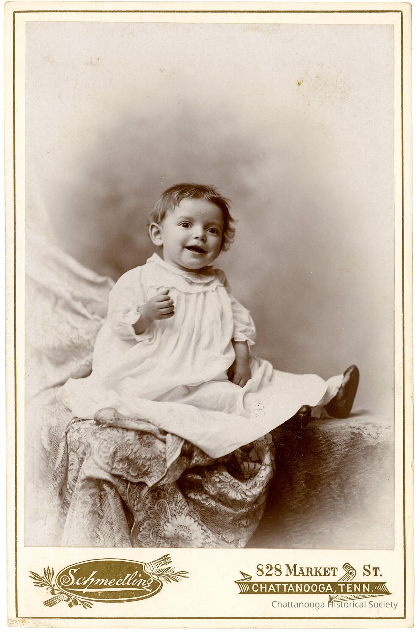 A photograph mounted on a cabinet card showing a baby. The baby is dressed in a long, white dress and is smiling at the photographer. Photo by Schmedling.