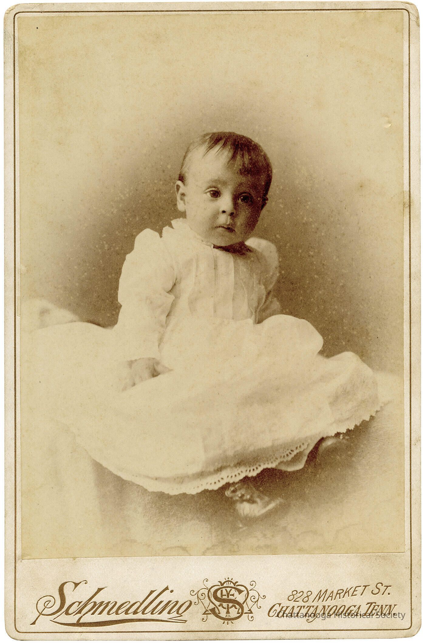 A photograph mounted on a cabinet card showing a baby in a white dressing gown. The sitting was at Schmedling's studio on 828 Market Street and shows the toddler sitting down with leather buttoned shoes peeking out from beneath their dress.