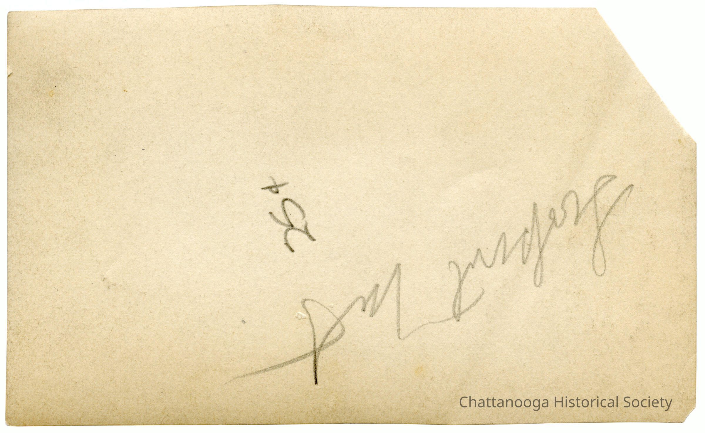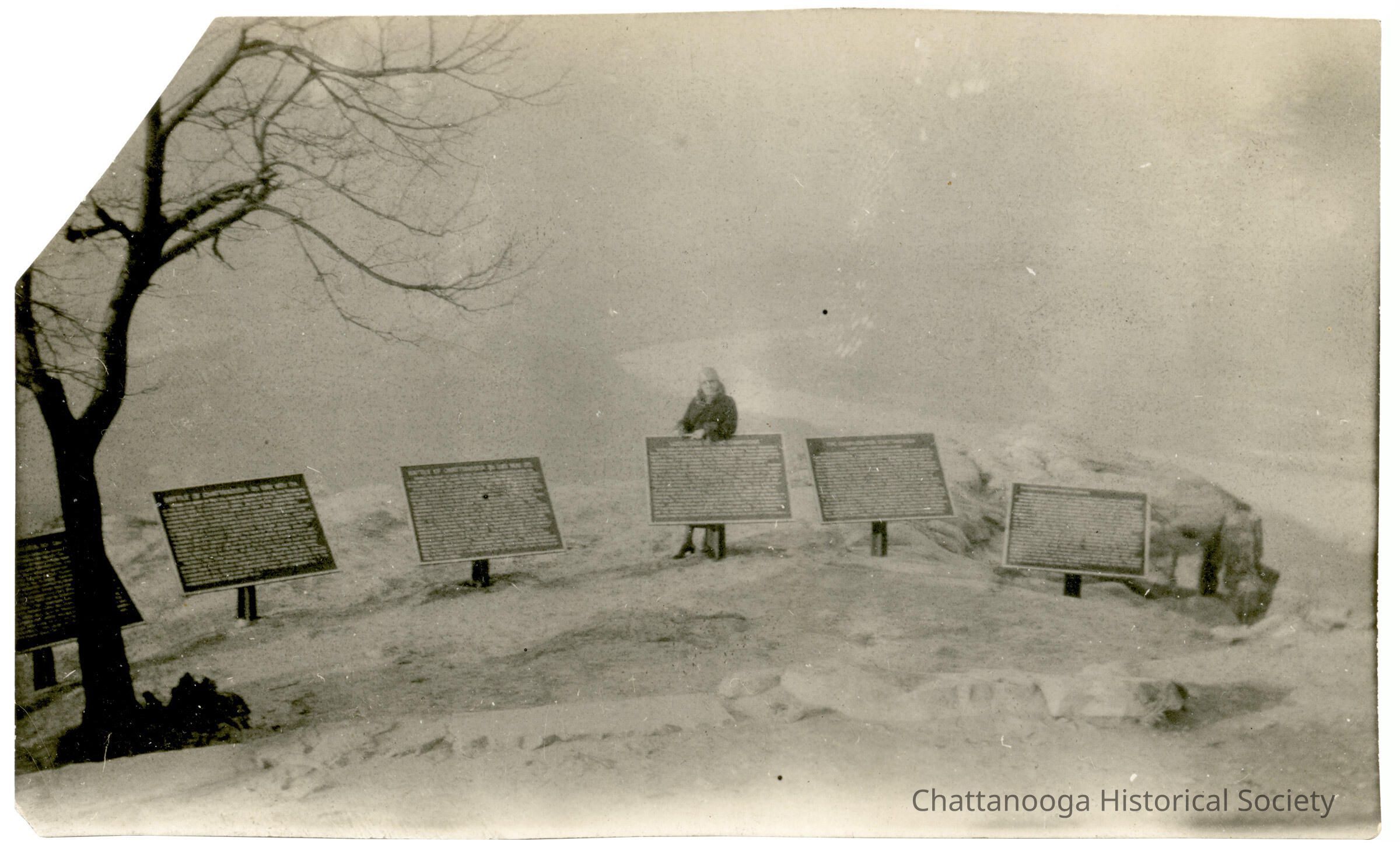 A photograph showing a woman posing beside the interpretive signs for the Battle of Wauhatchie at Point Park at Lookout Point, Lookout Mountain, Tennessee.Photograph Details