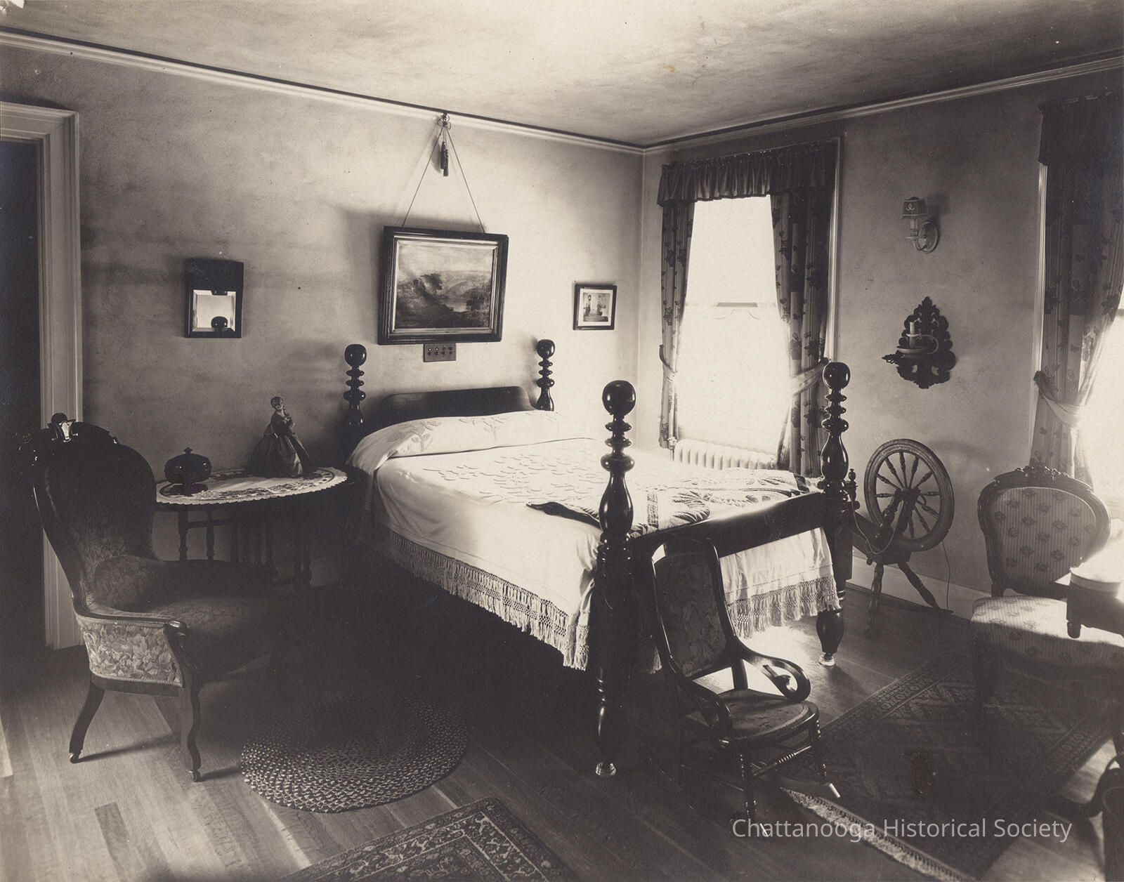 Black and white photograph of a bedroom inside of Garnet and Frieda Carter's house in Rock City on Lookout Mountain, Georgia. The room features a four poster bed at center with a chenille bedspread. There are several chairs on around the bed as well as a flax wheel between the two curtained windows. A canvas painting is on the wall above the bed's headboard as well as a series of 4 button switches below the frame.Photograph Details
