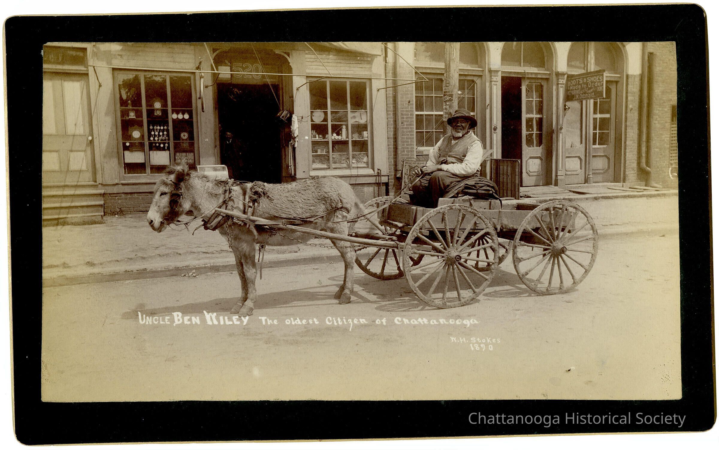 A black and white photograph mounted on a dark green, gold rimmed cabinet card showing Uncle Ben Wiley, the oldest citizen in Chattanooga, by Wm. Stokes in 1890. Uncle Ben is sitting in a wagon led by a small donkey, posed in front of Market Street storefronts. The business on the right has a hanging sign that reads "Boots and Shoes Made to Order, Repairing Neatly and [?] Done. J.M. Odonald." The shop at