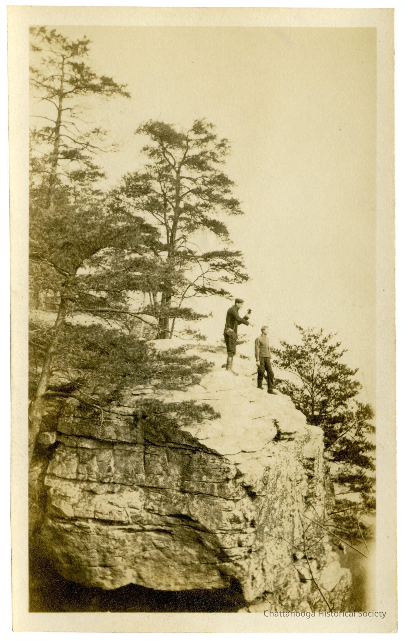 A photograph of two men posing on a bluff located between the Rock City area and Lula Lake on Lookout Mountain, GA.Photograph Details