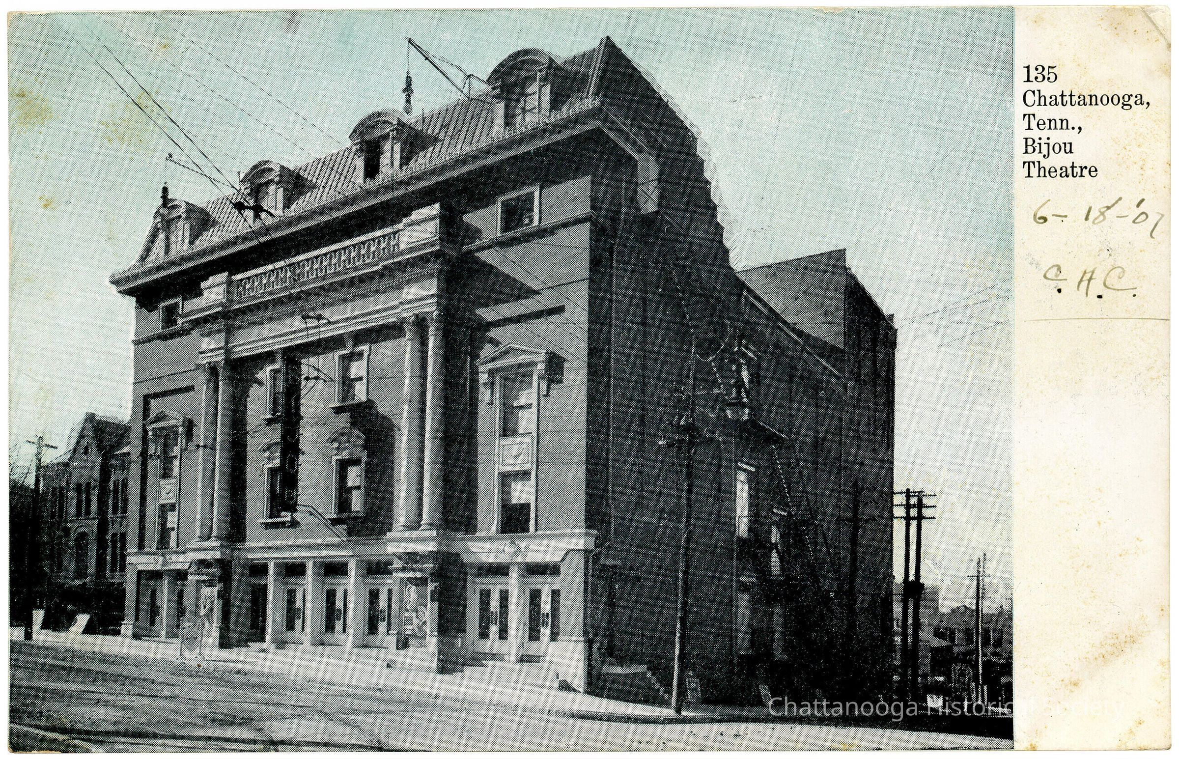 A postcard with the front showing a photograph of Bijou Theatre. The theater was a large brick structure designed by Fuller Claflin and operated as a Paramount theater. The inscription on the side reads "135. Chattanooga, Tenn., Bijou Theatre" and "6-18-'01 C.H.C." is hand written underneath.
