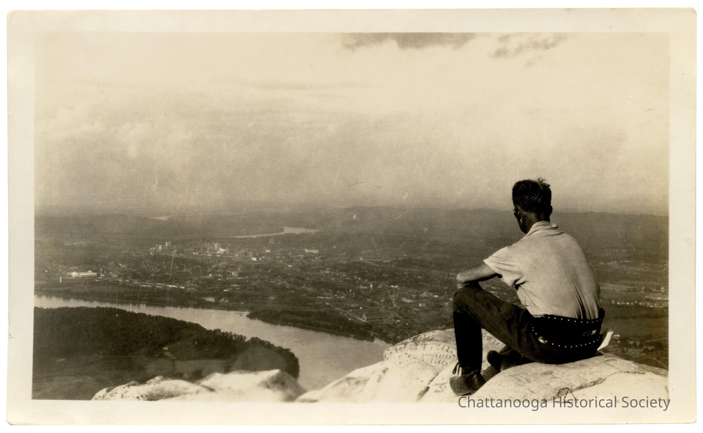 A photograph showing a man wearing a biker belt bearing the initials T.I.M at Lookout Point. The man is sitting on the point, overlooking the city and river.Photograph Details