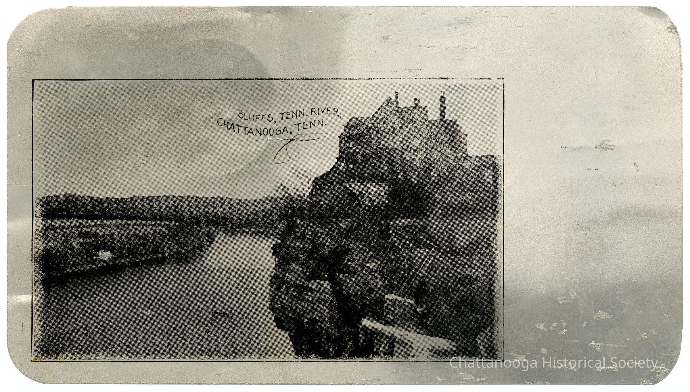 An aluminum postcard with the front showing the Bluff View of Chattanooga, Tennessee. The front reads "Bluffs, Tenn. Rover., Chattanooga, Tenn." The bluff is prominently shown on the right with the Tennessee River below and Maclellan Island to the left. The home of C. A. Raht can be seen on the right at the edge of the bluff.