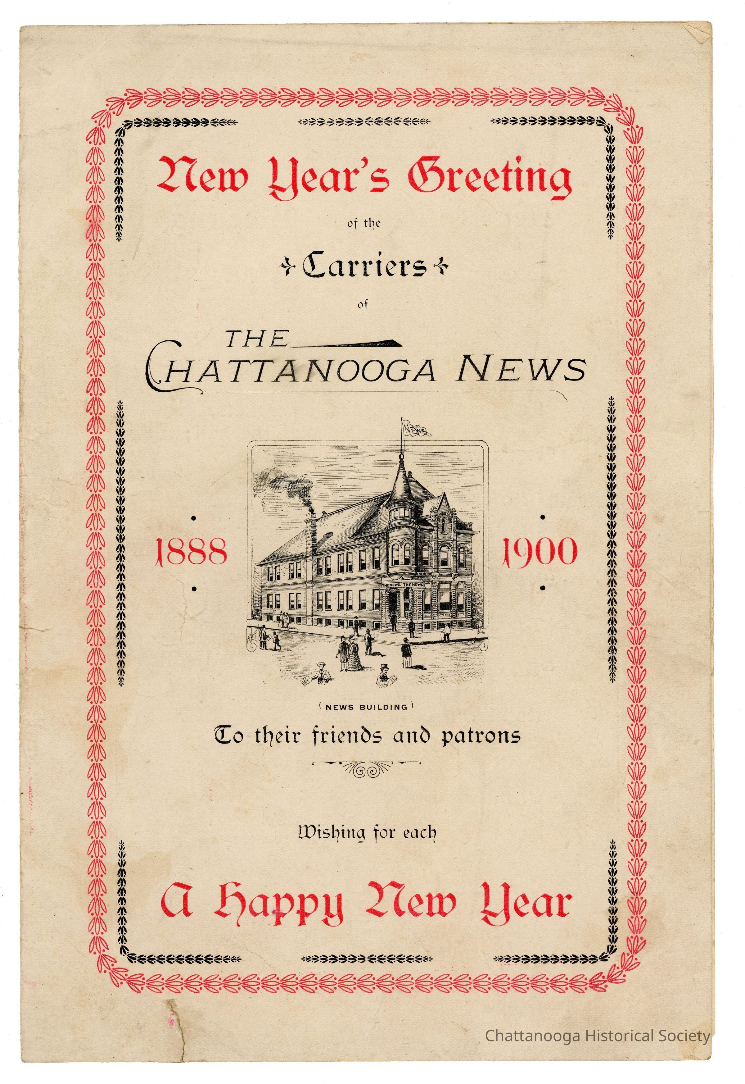 A printed insert from the Chattanooga News for the newspaper's patrons. The booklet is titled "New Year's Greeting of the Carriers of The Chattanooga News; 1888 - 1900; To their friends and patrons Wishing for Each A happy New Year". The booklet has an image of the newspaper's headquarters at center.