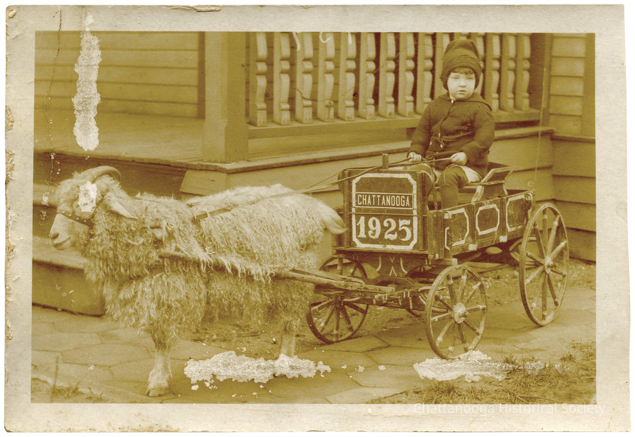 "Chattanooga" and the year "1925" are painted on a sign affixed to the wagon's front. The wagon features two small font wheels and two taller rear wheels. The boy is wearing a dark jacket and woven beanie-type cap.Subject Place