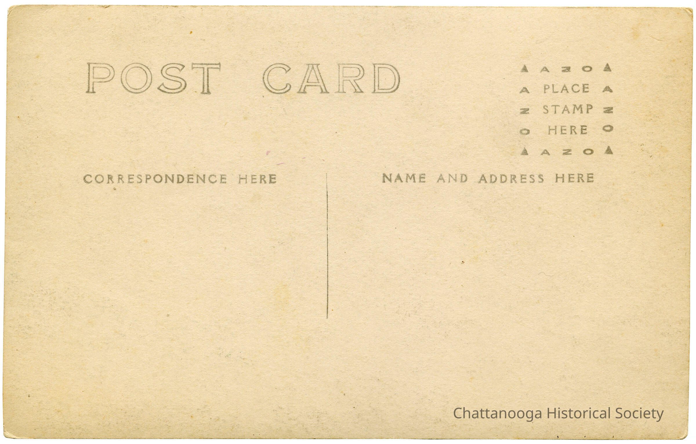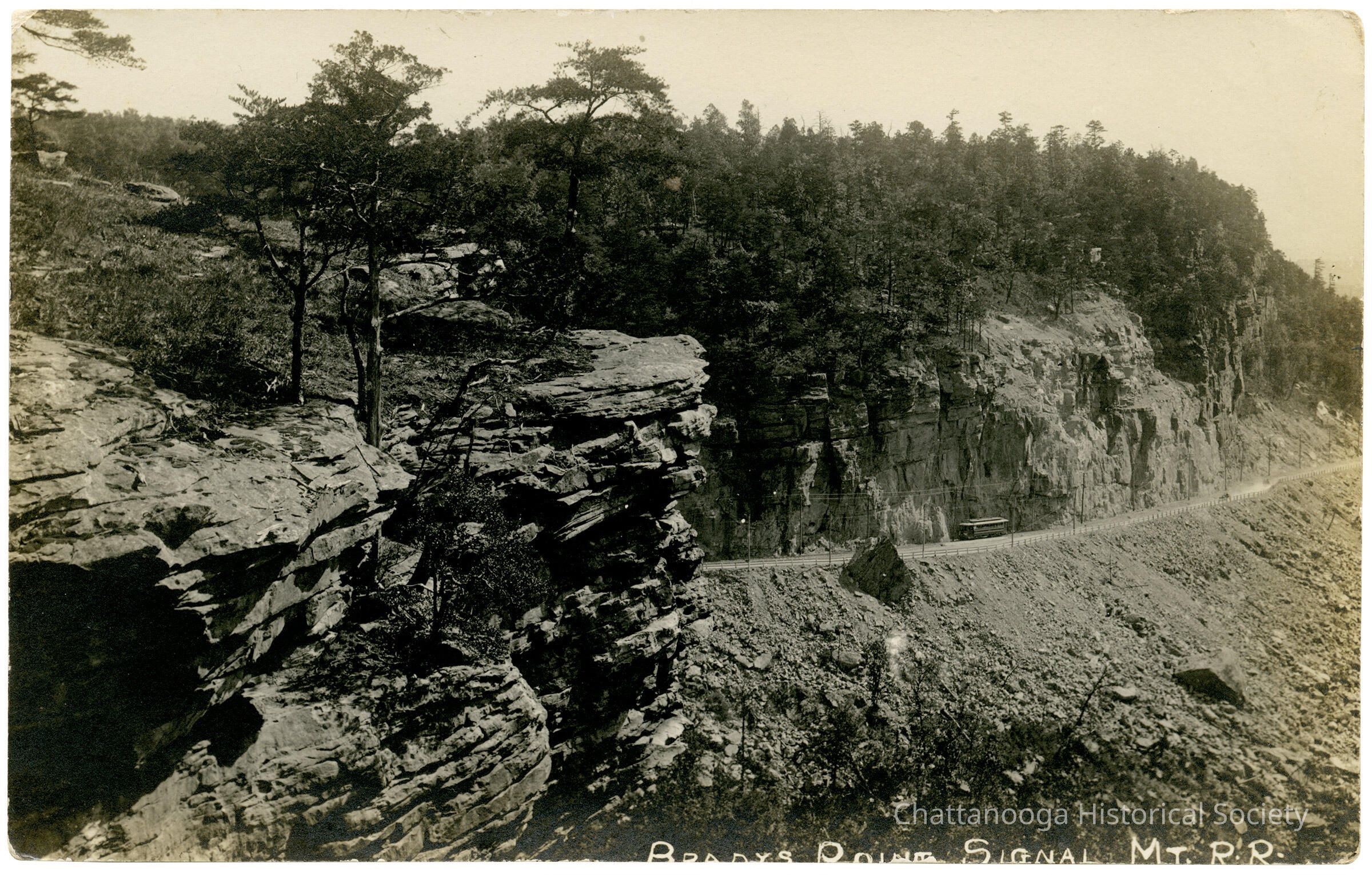 A postcard with the front showing a photograph of Brady Point on Walden's Ridge in Signal Mountain. A streetcar can be seen in the background traveling up Chattanooga Traction Company's rail line connecting Chattanooga with the Signal Mountain Inn.