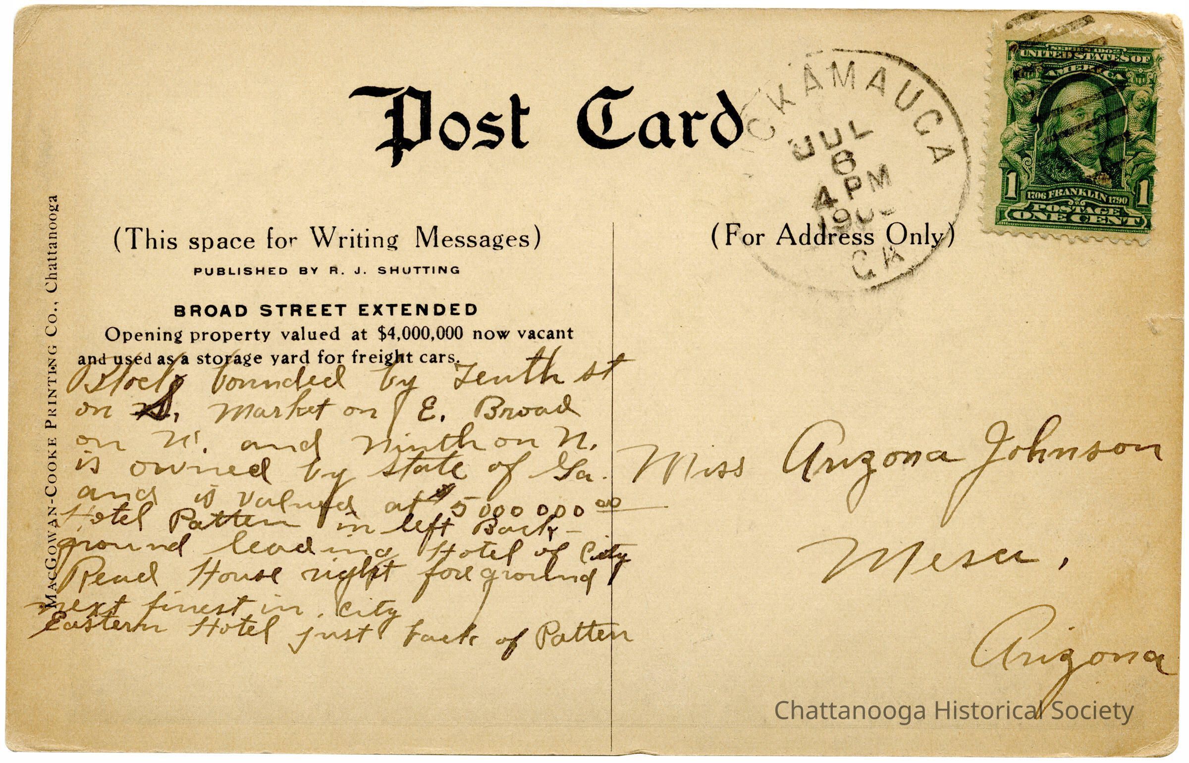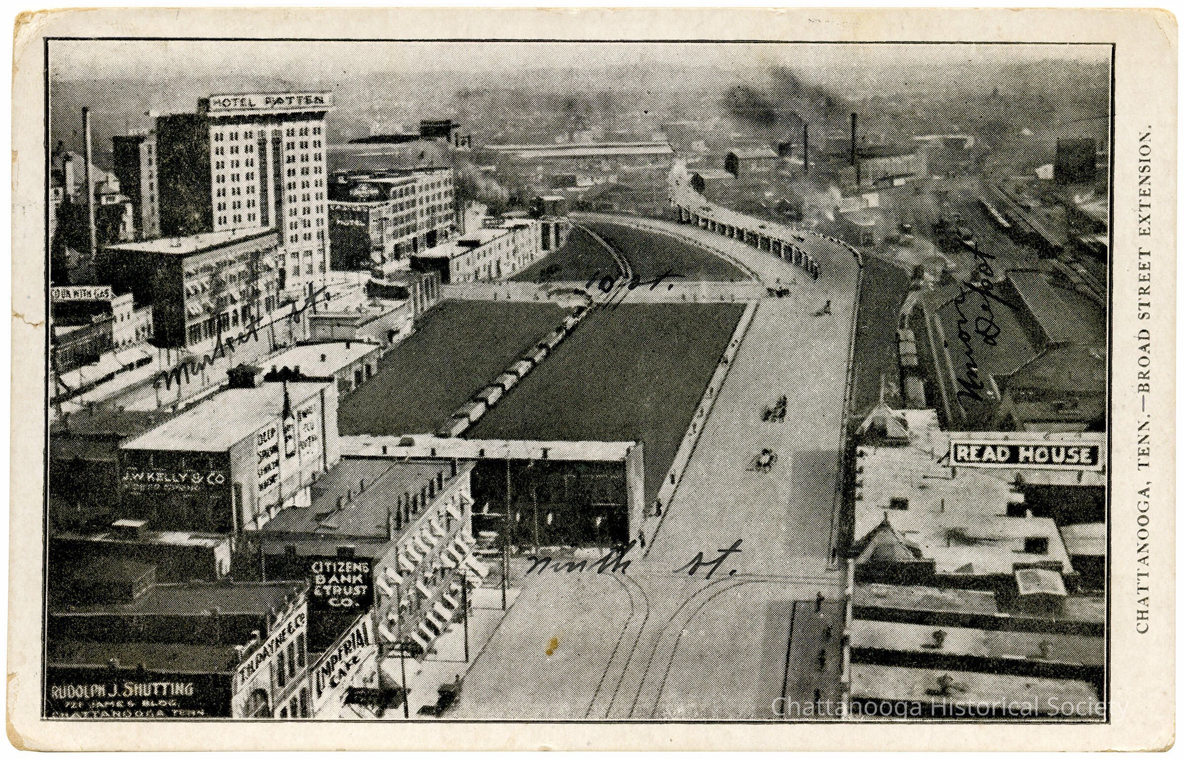 A postcard with the front showing an illustration by Rudolph J. Shutting of an imagined extension of Broad Street in downtown Chattanooga. It wouldn't be until 1926 before the City of Chattanooga would force an extension of South Broad Street by demolishing buildings along 9th Street during the darkness of night.