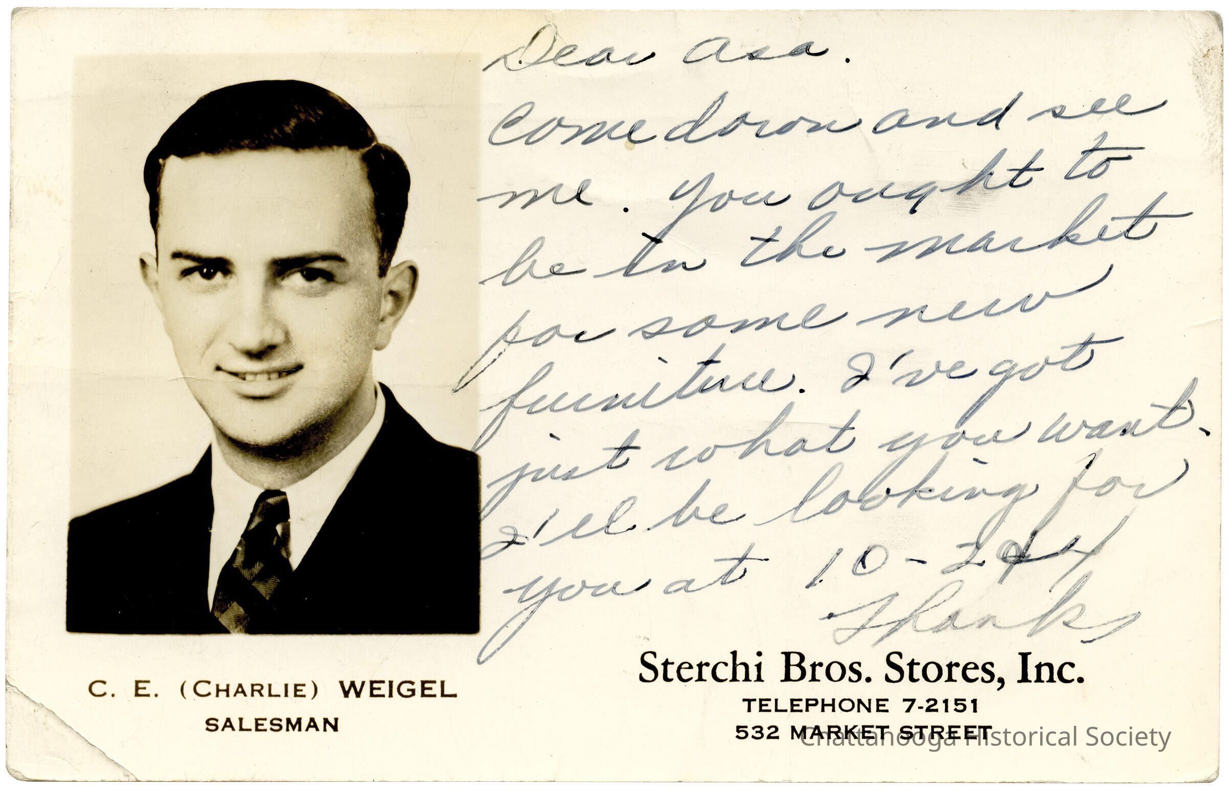 A salesman's postcard for C. E. "Charlie" Weigel, a salesman for Sterchi Brothers Stores, Inc. The postcard has a photograph of Mr. Weigel on the left with room for a note on the right (see transcription). In his message, he invites a prospect to visit the store to see their new inventory.