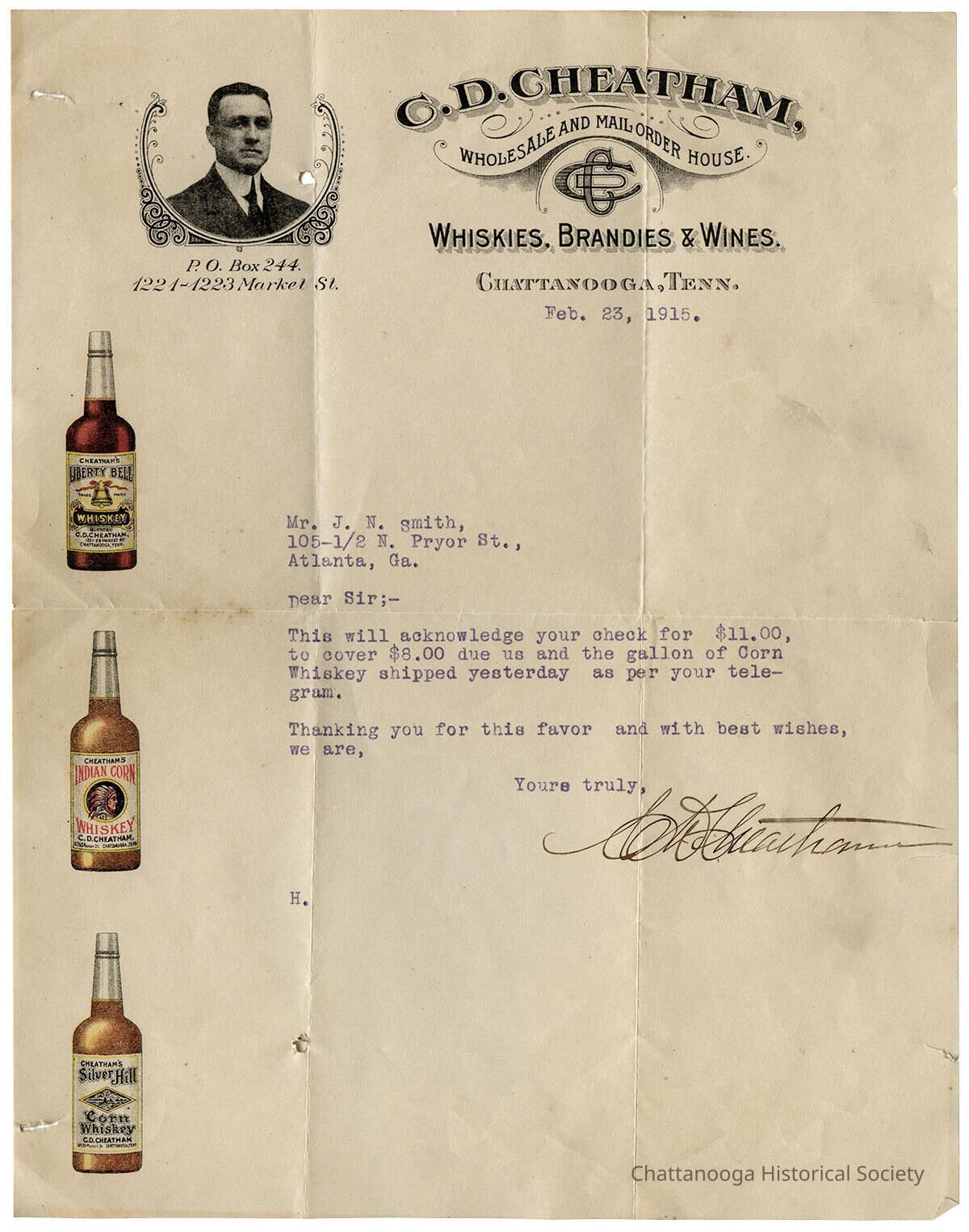 Correspondence from C. D. Cheatham acknowledging receipt of payment for a previous balance and the sale of a gallon of corn whiskey.