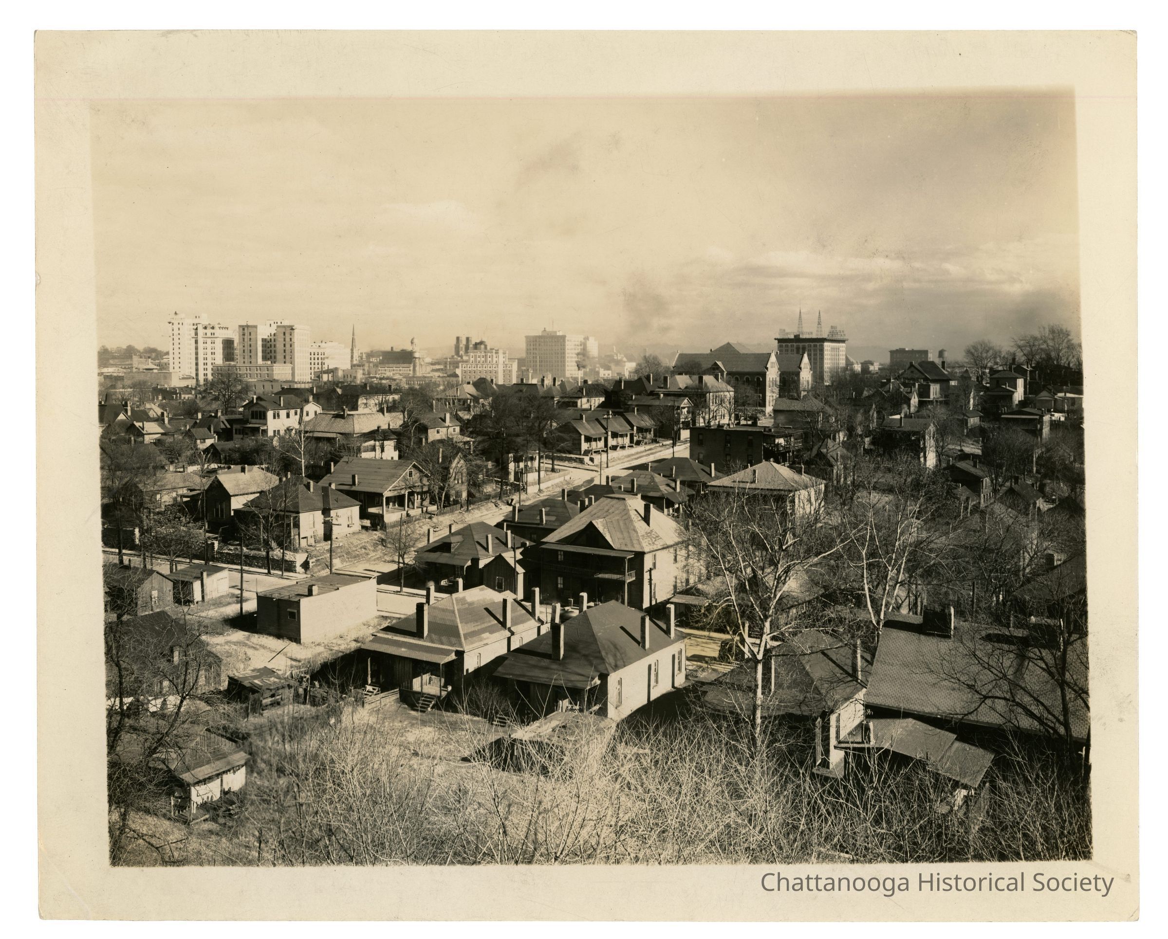 Black and white photograph of downtown Chattanooga with the Hotel Patton in the background. The view is taken from Cameron Hill and shows what appears to be the corner of 11th and Terrace, with the Third Ward School on 11th in the background.Container